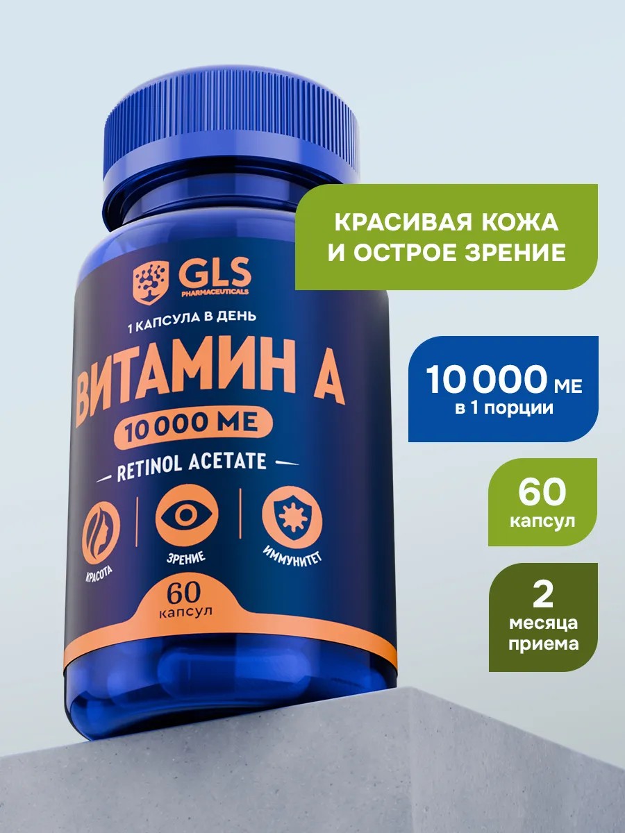 Витамин А GLS 10000 МЕ, бад для кожи и зрения, 60 капсул