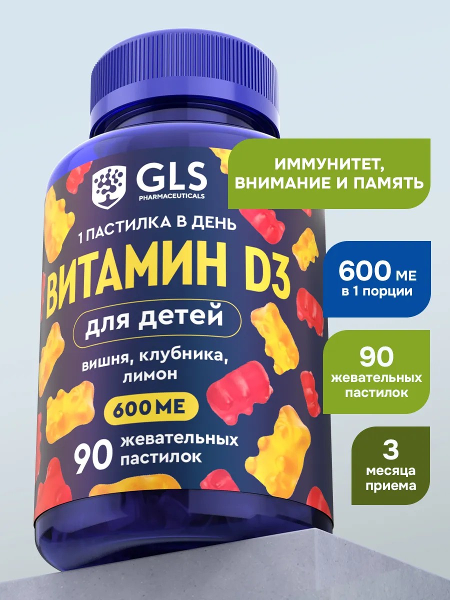 Витамин D3 для детей GLS со вкусом вишни, клубники, лимона — необходимый компонент для регуляции кальций-фосфорного обмена.