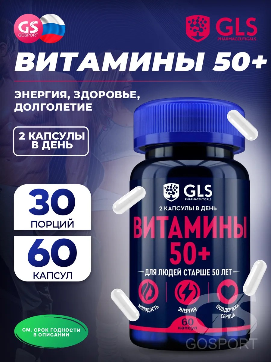 Годен до 08.04.2027. Витаминный комплекс Витамины 50 плюс 60 капсул. Витамины 50 плюс GLSСпециально разработанный комплекс для людей старше 50 лет помогает сохранить хорошее самочувствие и активность. Обладает высокой антиоксидантной активностью. Способствует снижению негативного влияния окислительного стресса на организм и поддержанию молодости и красоты — Anti-age эффект.Оказывает противовоспалительное и иммуномодулирующее действие, снижает риск развития и тяжесть течения бактериальных и вирусных заболеваний, ускоряет выздоровление.Поддерживает здоровье сердечно-сосудистой системы. Укрепляет стенки сосудов, уменьшает проницаемость и ломкость капилляров. Улучшает микроциркуляцию, профилактирует развитие атеросклероза, инсульта и инфаркта.Препятствует развитию возрастных, дегенеративных изменений головного мозга и глаз. Положительно влияет на здоровье нервной системы, обладает антистрессовым действием, способствует снижению психоэмоционального состояния и стресса.Улучшает обмен веществ и повышает уровень энергии, выносливости и работоспособности. Поддерживает здоровье кожи, волос, ногтей и слизистых оболочек.