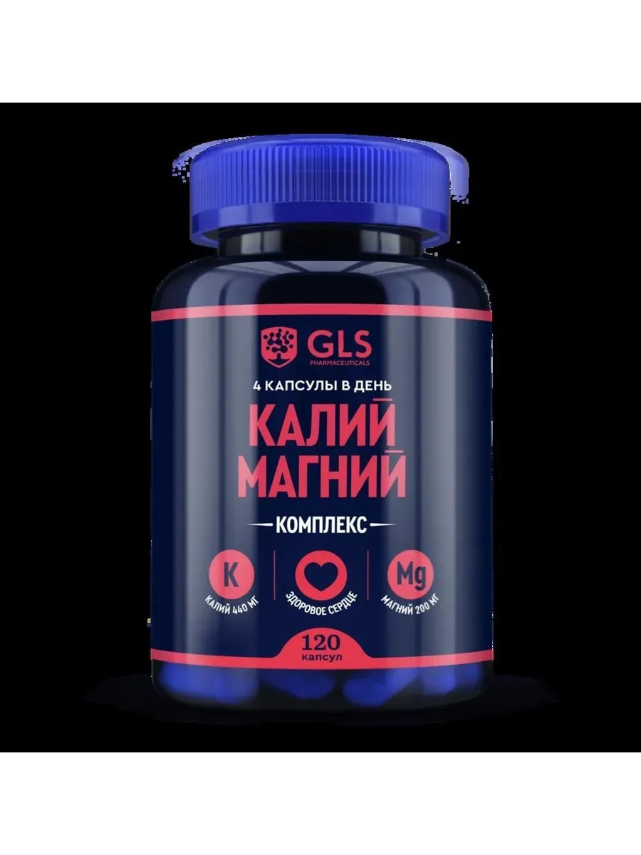 GLS Калий магний - Биологически активная добавка (БАД) к пище - комплекс здоровое сердце4 вегетарианские капсулы содержат:Калия цитрат в т.ч. калий - 440 мг;Магния оксид в т.ч. магний - 200 мг.АКТИВНЫЕ ИНГРЕДИЕНТЫ:• Калий участвует в поддержании гомеостаза - постоянства внутренней среды организма, кислотно-щелочного равновесия крови, состава клеточной и межклеточной жидкости. Нормализует водно-солевой баланс и способствует уменьшению отеков.Положительно влияет на работу сердца, участвует в регуляции частоты сердечных сокращений, обладает сосудорасширяющим действием, нормализует артериальное давление. Снижает риск развития инфаркта и других сердечно-сосудистых заболеваний.Необходим для передачи нервных импульсов, предотвращает развитие мышечных спазмов.• Магний обладает успокаивающим действием, положительно влияет на эмоциональное состояние, снижает негативное влияния стресса на организм, нормализует сон.Помогает поддерживать нормальную работу и снижает риск развития сердечно-сосудистых заболеваний.Участвует в регуляции мышечных сокращений, предотвращает появления спазмов.