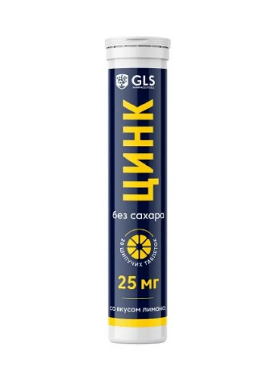 GLS ЦИНК без сахара со вкусом лимона - Биологически активная добавка (БАД) к пище - цитрат цинка - органический, легкоусвояемый источник цинка.Оказывает иммуномодулирующее действие, укрепляет иммунитет.Ускоряет выздоровление, снижает тяжесть симптомов и риск развития осложнений бактериальных и вирусных заболеваний в т.ч. COVID-19.Стимулирует синтез коллагена и кератина, регулирует работу сальных желез.Укрепляет и улучшает внешний вид кожи, волос и ногтей.Предотвращает выпадение и стимулирует рост волос.Ускоряет заживление различных повреждений кожи.Проявляет антиоксидантные свойства, способствует замедлению процессов старения в т.ч. возрастных изменений сетчатки и ухудшения зрения - Anti-age effect.Принимает участие в синтезе половых гормонов, поддерживая репродуктивную функцию и сексуальную активность у женщин и мужчин.Стимулирует секрецию и повышает чувствительность клеток к инсулину, способствуя регуляции уровня сахара в крови.1 шипучая таблетка (суточная дозировка) содержат:Цинка цитрат в т.ч. цинк 25 мгПищевая ценность 1 таблетки (3,8 г) (средние значения): углеводы - 1,5 гЭнергетическая ценность: 40 кДж/ 10 ккал