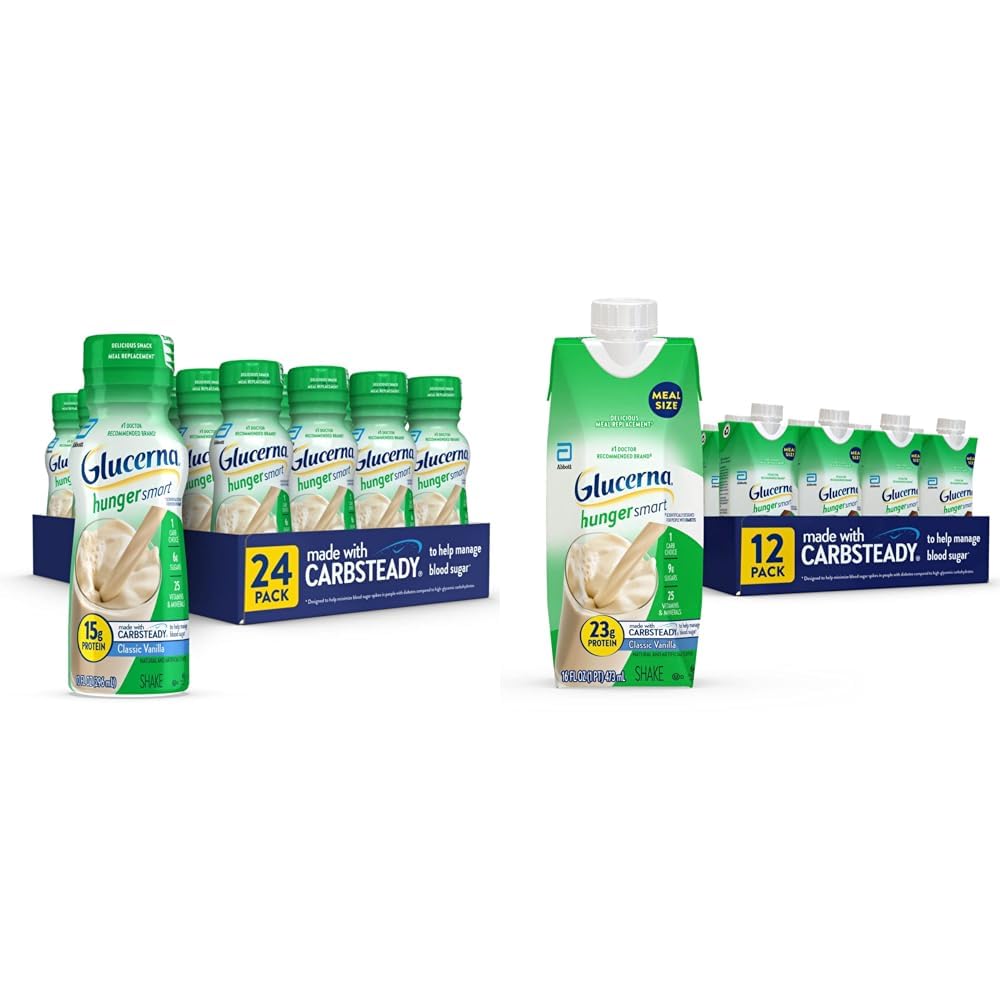 Glucerna Hunger Smart Shake, Diabetic Drink, Blood Sugar Management, 15g Protein, 180 Calories, Classic Vanilla, 10-fl-oz Bottle, 24 Count Glucerna Hunger Smart shakes are scientifically designed as meal or snack replacements for people with diabetes. Glucerna Hunger Smart shakes have CARBSTEADY, unique blends of slow-release carbohydrates to help minimize blood sugar spikes, as well as 15g of high-quality protein to help you manage hunger. Each shake contains nutrients for immune system support, like vitamins A D, zinc, and antioxidants (vitamins C E). Gluten-free and suitable for lactose intolerance.‡ Glucerna is the 1 nutrition brand recommended by doctors for people with diabetes. Designed to help minimize blood sugar spikes compared to high-glycemic carbohydrates. † The SNAP name is a service mark of the US Department of Agriculture USDA does not endorse any goods, services, or enterprises. ‡ Not suitable for people with galactosemia. Glucerna Hunger Smart Meal Size Shake, Diabetic Meal Replacement, Blood Sugar Management, 23g Protein, 250 Calories, Classic Vanilla, 16-fl-oz Carton, 12 Count Glucerna Hunger Smart Meal Size shakes are scientifically designed as meal replacements for people with diabetes. Our meal-size nutrition shakes have CARBSTEADY, unique blends of slow-release carbohydrates to help minimize blood sugar spikes, as well as 23g of high-quality protein to help you manage hunger. Each shake contains nutrients for immune system support, like vitamins A D, zinc, and antioxidants (vitamins C E). Gluten-free and suitable for lactose intolerance.‡ Glucerna is the 1 nutrition brand recommended by doctors for people with diabetes. Designed to help minimize blood sugar spikes compared to high-glycemic carbohydrates. † The SNAP name is a service mark of the US Department of Agriculture USDA does not endorse any goods, services, or enterprises. ‡ Not suitable for people with galactosemia.Product 2: 23g HIGH-QUALITY PROTEIN: Supports muscle health and helps you manage hunger. Product 2: 1 DOCTOR RECOMMENDED BRAND: Glucerna is the 1 doctor-recommended nutrition brand for people with diabetes. Product 2: DESIGNED TO HELP MANAGE BLOOD SUGAR : Has CARBSTEADY, unique blends of slow-release carbohydrates to help minimize blood sugar spikes. Product 2: SCIENTIFICALLY DESIGNED FOR PEOPLE WITH DIABETES: Glucerna Hunger Smart nutritional shakes are a simple way to manage carb intake and help you achieve your nutrition goals. Product 1: 15g HIGH-QUALITY PROTEIN: Supports muscle health and helps you manage hunger. Product 1: 1 DOCTOR RECOMMENDED BRAND: Glucerna is the 1 doctor-recommended nutrition brand for people with diabetes. Product 1: DESIGNED TO HELP MANAGE BLOOD SUGAR : Has CARBSTEADY, unique blends of slow-release carbohydrates to help minimize blood sugar spikes. Product 1: SCIENTIFICALLY DESIGNED FOR PEOPLE WITH DIABETES: Glucerna Hunger Smart nutritional shakes are a simple way to manage carb intake and help you achieve your nutrition goals.