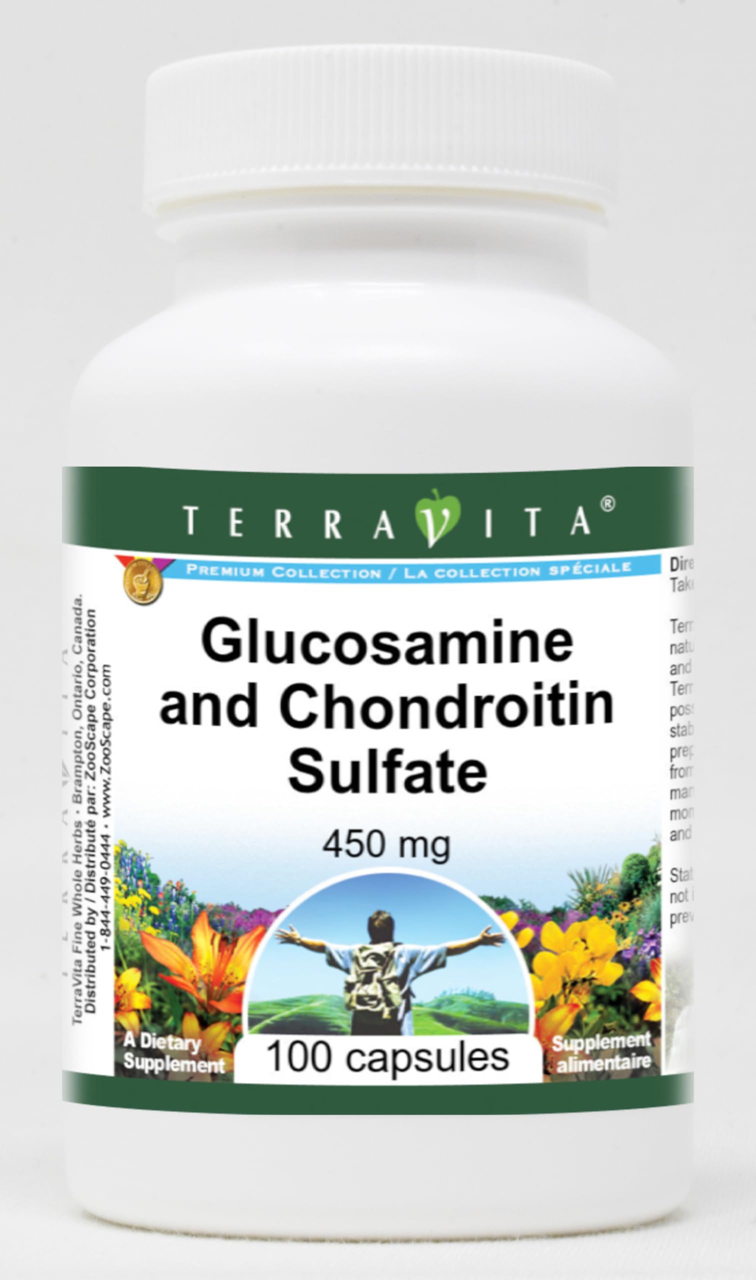 Glucosamine and Chondroitin Sulfate - 450 mg (100 capsules, ZIN: 512045) Packaged in the United States in a GMP certified facility (Good Manufacturing Practice). No fillers. Manufacturer: TerraVita Size: 100 capsules Easy-to-swallow Capsules in a sealed bottle. Ingredients: Gelatin, Water, Glucosamine Sulfate - 225 mg, Chondroitin Sulfate - 225 mg