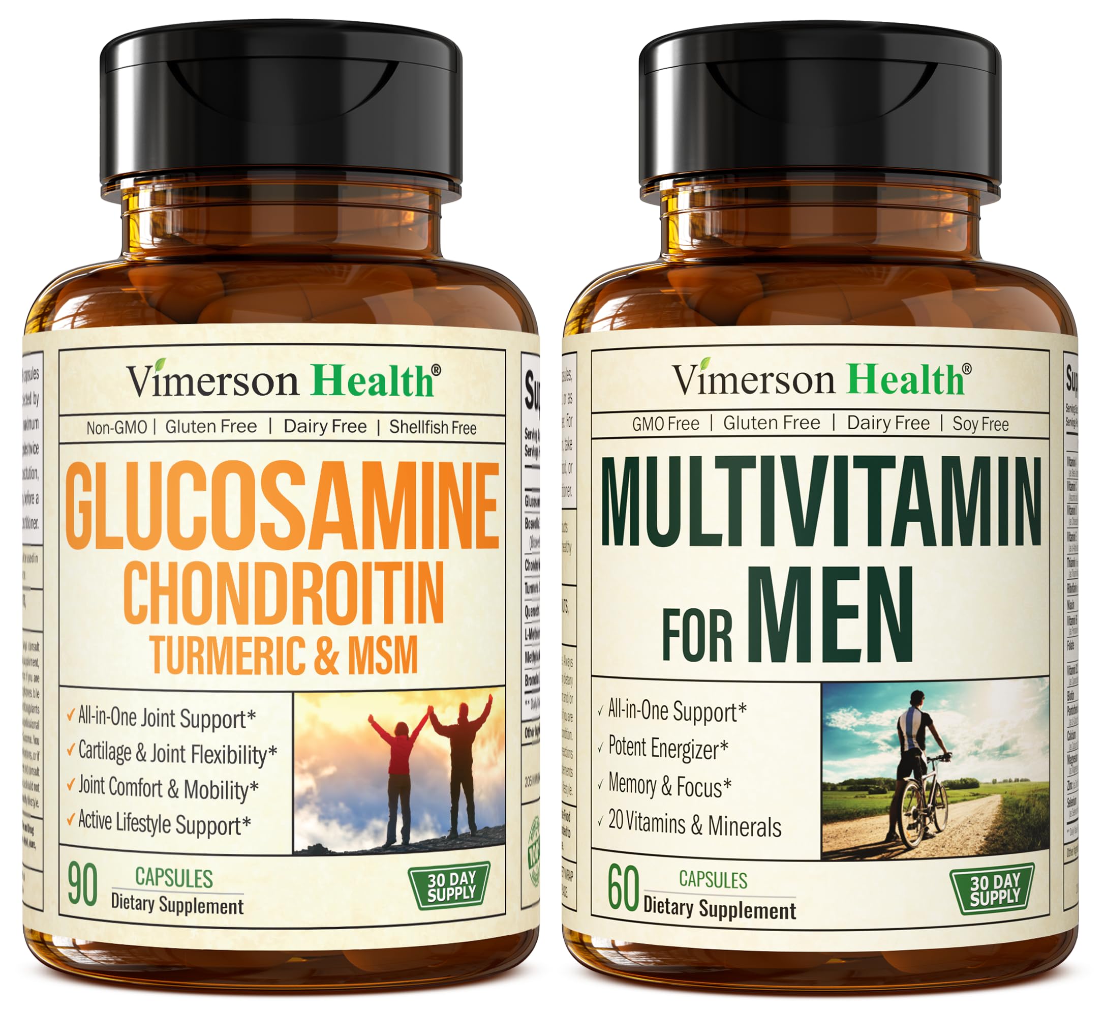 GMO-free: Here at Vimerson Health, we want to provide you with the best supplements possible. Both of the vitamins and supplements in this bundle are made using ingredients that are entirely GMO free. Joint Support: We've added glucosamine chondroitin MSM and turmeric to this vitamins bundle to make sure you get a quality joint support supplement too! The msm powder and turmeric can help you to maintain healthy inflammation levels. Immune Support: Our immune systems need many nutrients for support. We've added vitamins D, A, C, E and zinc to our men's multivitamins to help your body to maintain a healthy immune system. Help Meet Your Nutritional Needs: We all know that we need to eat a healthy and balanced diet to provide our bodies with everything they need. Sometimes, this can be difficult though. Our multivitamin for men can help by supplementing your healthy diet. Bundle for Men: Our Men's Multivitamin and Joint Support bundle combines two of our favorite vitamins for men. In this bundle you will get one bottle of mens multivitamins and one bottle of our joint support vitamin supplements.