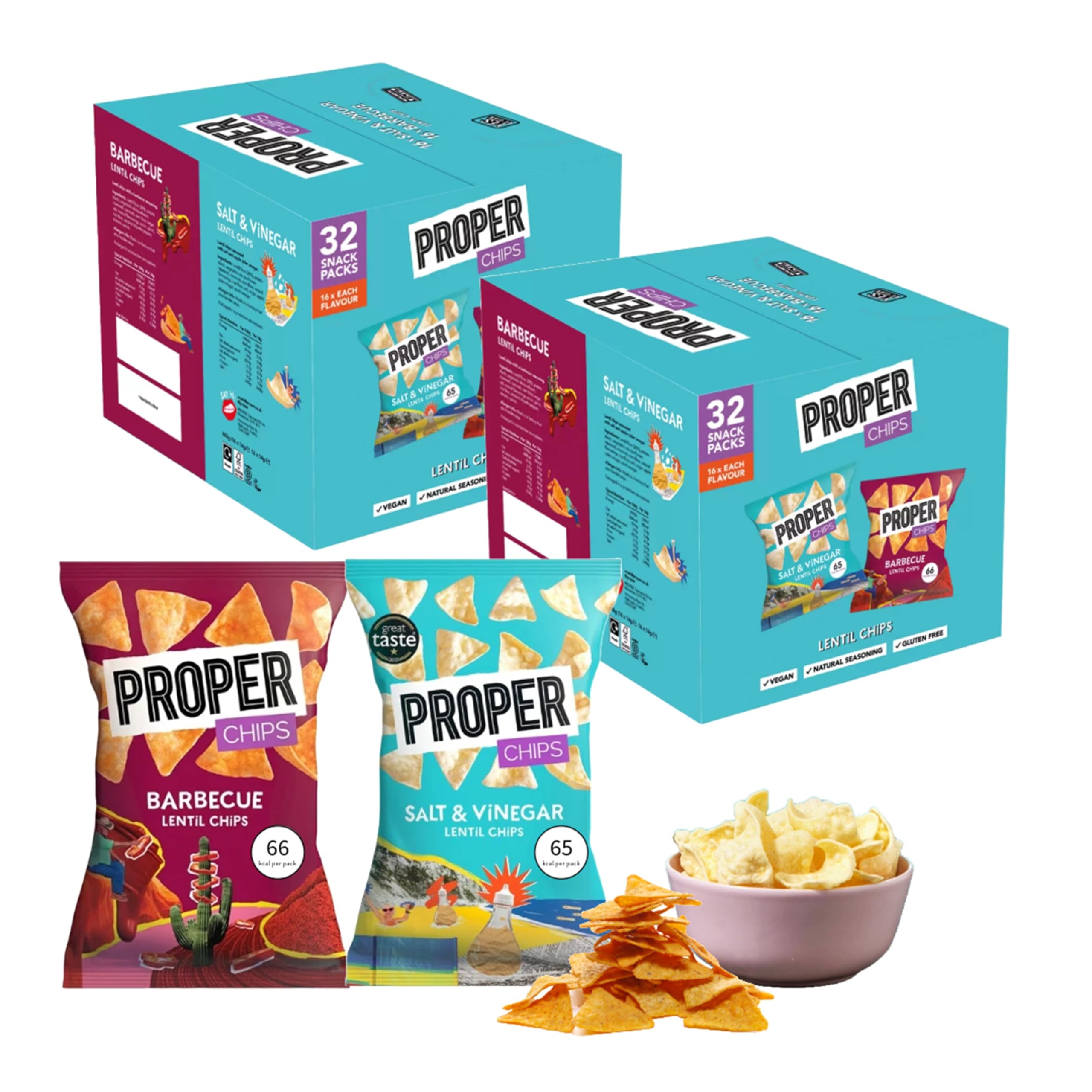 Gluten Free Lentil Crisps Multipack - Pack of 2 x 32 Vegan Proper Chips BBQ & Salt Vinegar Low Calorie Snack Box with Topline Card. Healthy Snacks for Kids Lunch Box Birthday Party Food Movie Night