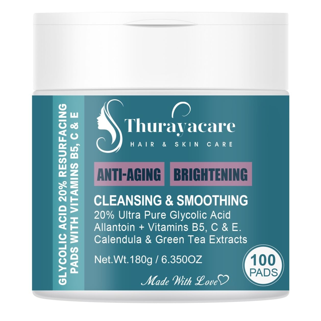 Long-Lasting Safe Quality Each jar includes 100 pre-soaked pads — up to 3 months of daily use. Manufactured in an FDA-registered, GMP-certified facility for strict quality and safety standards. For best results, apply sunscreen during the day when using glycolic acid products. Convenient, Spa-Quality Resurfacing Includes 100 pre-soaked textured pads with easy-to-use tweezers for mess-free application. Dual-sided design provides gentle yet powerful exfoliation — no rinse needed. Soothing Gentle for All Skin Types Enhanced with Green Tea Allantoin, these pads calm redness, reduce irritation, and refresh the skin. Safe and effective for sensitive, oily, and acne-prone skin. Anti-Aging Skin-Firming Support Infused with Vitamins B5 E, the pads deeply hydrate, nourish, and reduce the appearance of fine lines and wrinkles — supporting youthful, firm skin texture. Fades Dark Spots Acne Scars Formulated with Niacinamide Vitamin C, these resurfacing pads target acne scars, hyperpigmentation, and discoloration while boosting skin clarity and brightness. Professional Exfoliation Brightening Packed with 20 Glycolic Acid, these exfoliating pads gently peel away dead skin cells, unclog pores, and reveal a smoother, more radiant complexion — perfect for dull, uneven skin.