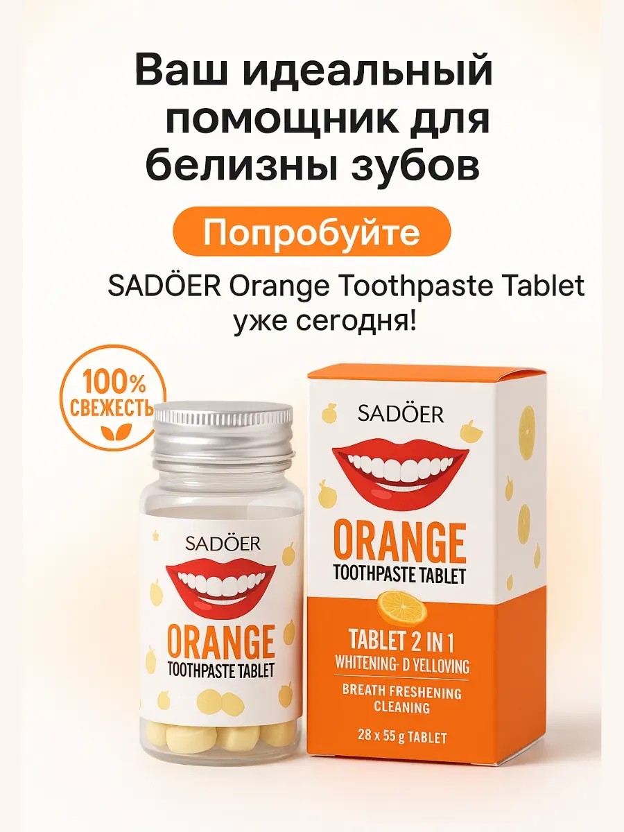 | Полное наименование товара | жевательные таблетки для чистки и отбеливания зубов, апельсиновая зубная паста в таблетках, 30 шт (28,5 г) |