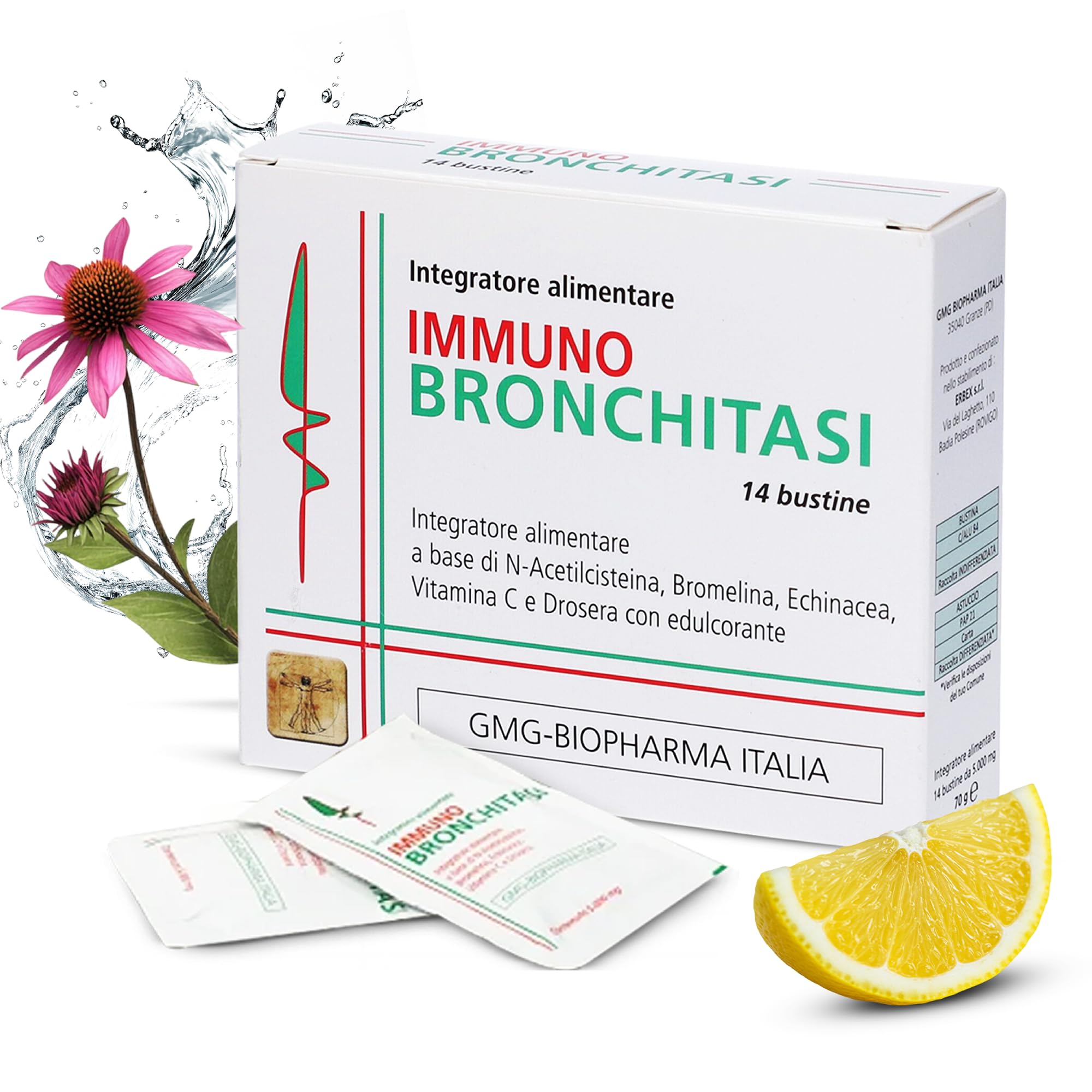 Immuno Bronchitase is a food supplement in convenient water-dissolving sachets, formulated to support respiratory function and boost the body's natural defenses. Thanks to a targeted combination of N-acetylcysteine, plant enzymes, and botanical extracts, it helps maintain respiratory health, especially during critical periods. A complete solution for better breathing and natural immunity support. INGREDIENTS N-acetylcysteine, bromelain, vitamin C, L-ascorbic acid, Echinacea purpurea moench root dry extract standardized to 4 total polyphenols, Drosera rotundifolia L. dry extract (1 4 herb with flowers), anti-caking agent: silicon dioxide, sweetener: sucralose.Plant extracts for your breathing: The presence of echinacea and sundew supports the body's natural defenses and promotes the well-being of the upper respiratory tract. Immune system support: Enriched with 90 mg of vitamin C, which contributes to the normal function of the immune system and the protection of cells against oxidative stress. Natural enzymatic action: Bromelain, an enzyme extracted from pineapple, supports the body's physiological processes, promoting freer breathing. Respiratory tract well-being: Contains 600 mg of N-acetylcysteine (NAC), known to promote the fluidity of bronchial secretions and contribute to normal respiratory function.IMMUNO BRONCHITASI 14 sachetsDESCRIPTION DU PRODUIT DESCRIPTION DU PRODUIT Immuno Bronchitase est un complément alimentaire en sachets pratiques à dissoudre dans l'eau, formulé pour soutenir la fonctionnalité des voies respiratoires et favoriser les défenses naturelles de l'organisme. Grâce à une combinaison ciblée de N-acétylcystéine, d'enzymes végétales et d'extraits botaniques, il aide à maintenir le bien-être du système respiratoire, en particulier pendant les périodes les plus critiques. Une solution complète pour mieux respirer et soutenir l'immunité de manière naturelle. INGRÉDIENTS N-acétylcystéine, bromélaïne, vitamine C acide L-ascorbique, échinacée purpurpurea moench racine extrait sec titré à 4 le polyphénol total, Drosera rotundifolia L extrait sec 1 4 herbe avec fleurs, agent antiagrégant dioxyde de silicium, édulcorfiant sucralose.Extraits végétaux pour votre respiration : la présence d'échinacée et de drosère aide les défenses naturelles de l'organisme et favorise le bien-être des premières voies respiratoires. Soutien au système immunitaire : enrichi en 90 mg de vitamine C, qui contribue au fonctionnement normal du système immunitaire et à la protection des cellules contre le stress oxydatif. Action enzymatique et naturelle : la bromélaïne, une enzyme extraite de l'ananas, soutient les processus physiologiques de l'organisme, favorisant une respiration plus libre. Bien-être des voies respiratoires : contient 600 mg N-acétylcystéine (NAC), connu pour favoriser la fluidité des sécrétions bronchiques et contribuer à la fonction respiratoire normale.