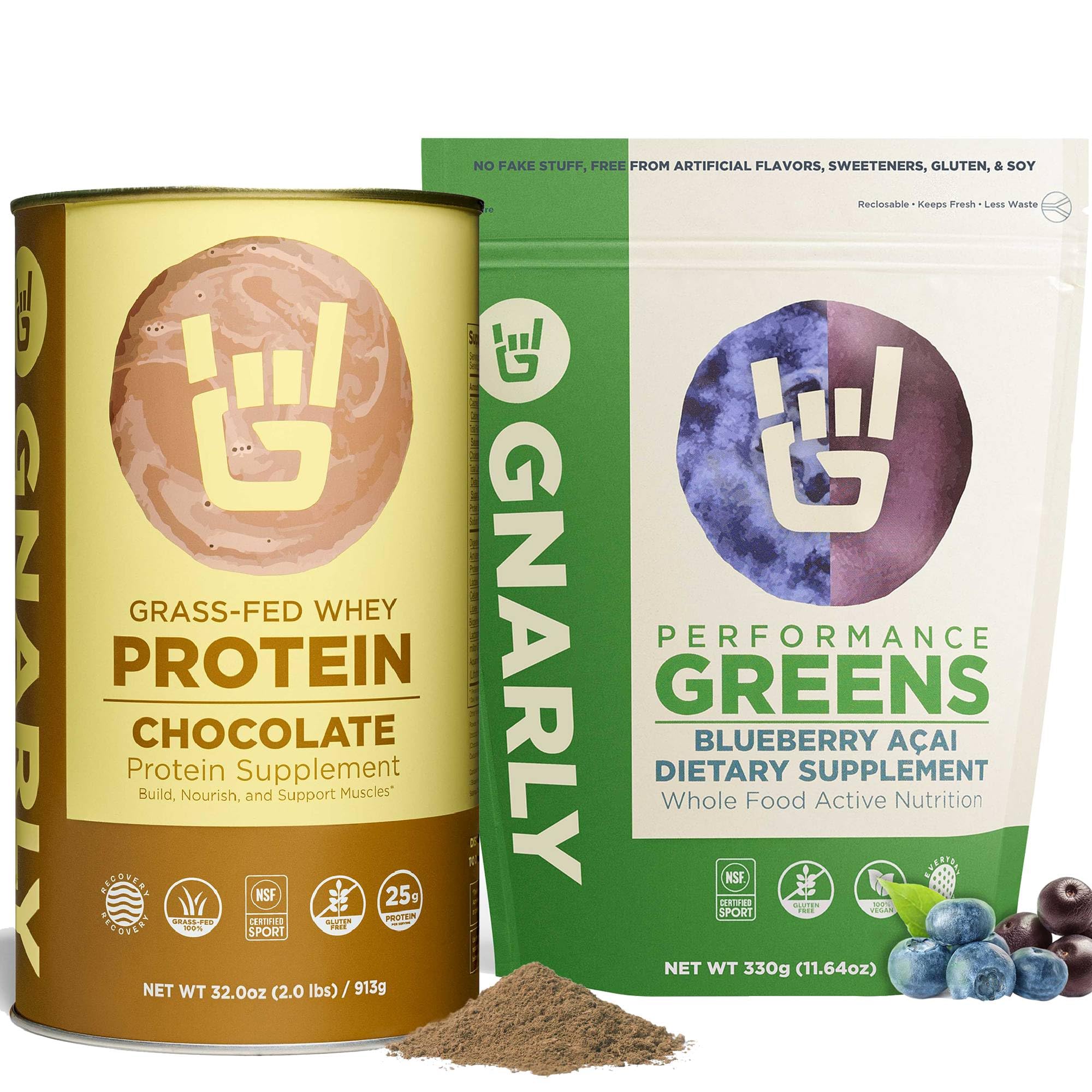 Gnarly Nutrition Performance Greens Blueberry A ai (11.64 oz) and Gnarly Whey Grass-Fed Protein Supplement Chocolate (32.0oz)