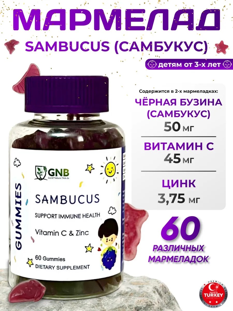 Жевательный мармелад самбукус — это уникальное сочетание здоровья и удовольствия, разработанное с использованием лучших ингредиентов. Производимый в Турции, этот витаминный десерт содержит экстракт бузины, который известен своими полезными свойствами. Каждая порция этого мармелада обогащена витамином С и цинком, способствующими поддержанию иммунной системы и защите организма от простуд и вирусов.