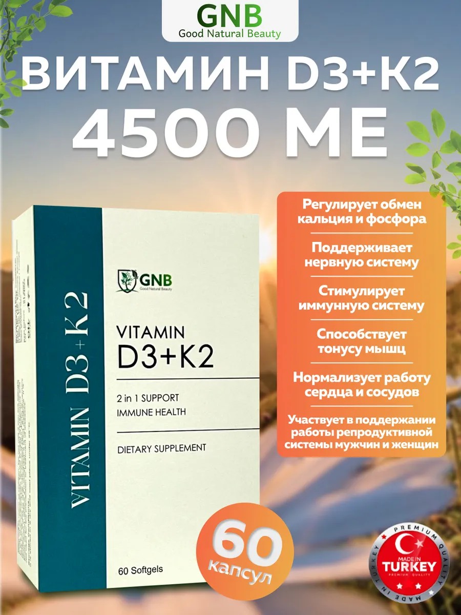 Витамин D3+K2 – это уникальный комплекс, который объединяет в себе две важнейшие нутриенты, незаменимые для поддержания оптимального уровня здоровья. В дозировке 4500 МЕ, этот продукт, произведенный в Турции, обеспечивает организм достаточным количеством витамина D3, который способствует усвоению кальция и фосфора, что особенно важно для здоровья костей и зубов.