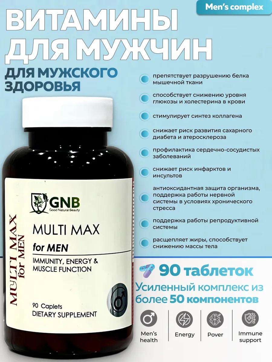 Комплекс витаминов для мужчин GNB Multi MAX специально для активных мужчин. Этот суперкомплекс включает в себя более 50 наиболее важных для здоровья и энергии ингредиентов, которые обеспечивают баланс витаминов и микроэлементов, сглаживают влияние стрессов, наполняют мужской организм жизненной силой. Продукт прекрасно подойдет жителям мегаполиса, которые постоянно испытывают потребность в витаминах и минералах для легкого пробуждения и высокого уровня энергии, отличной памяти, правильного метаболизма, стойкого иммунитета, мужского здоровья и силы.