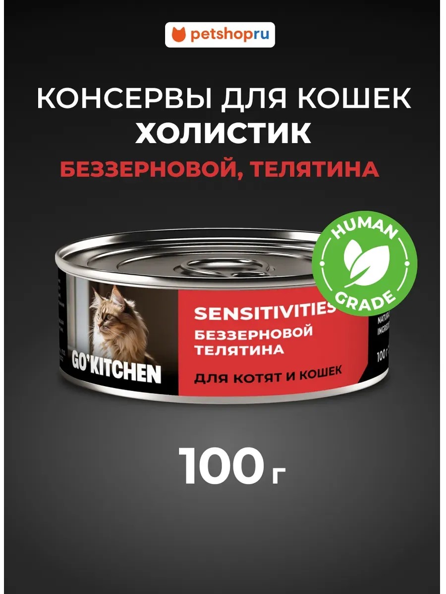 GO'KITCHEN SENSITIVITES с телятиной - это беззерновой влажный корм с высоким содержанием мяса, созданный специально для кошек и котят с чувcтвительным пищеварением.
