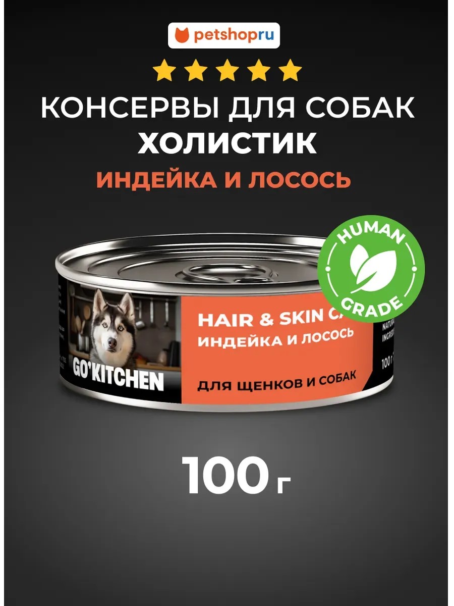 Влажный корм холистик-класса GO'KITCHEN HAIR&SKIN CARE с индейкой и лососем - это полнорационное питание, разработанное специально для поддержания здоровья кожи и шерсти вашей собаки!