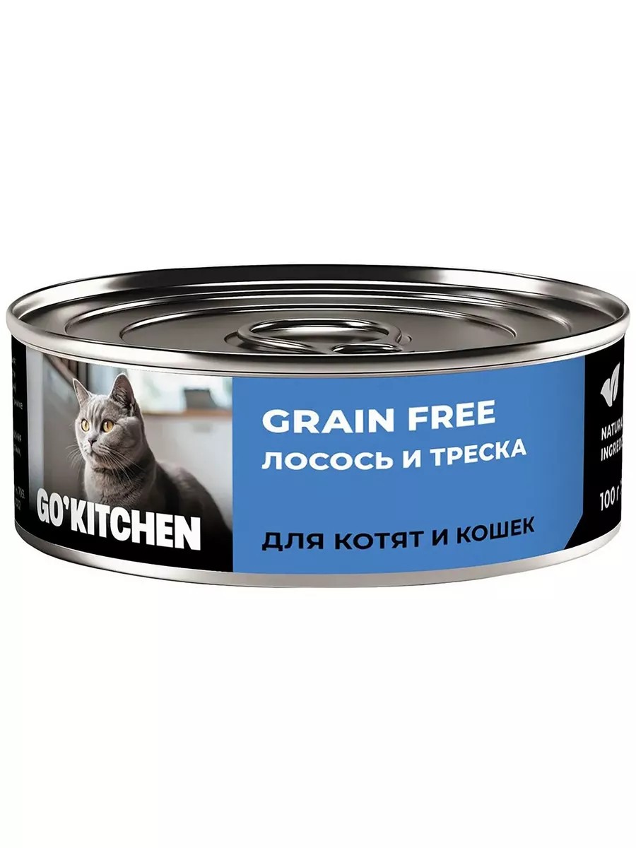 Cat food 100 g x 12 pcs. Go! Kitchen Grain Free (canned) food for kittens and cats, grain-free, with salmon and cod, 100 g Key features: 65% animal protein. Holistic class. Grain-free formula. Natural ingredients. Suitable for adult cats and kittens from 3 months of age. The high-protein and grain-free recipe is specially designed for energetic animals. High-quality meat as a source of protein. No added artificial colors, flavors or preservatives. Ingredients: salmon 50%, salmon broth, cod 15%, cranberry, flaxseed, sunflower oil, egg powder. Nutritional value: moisture - 80%, protein -5.4g, fat - 1.8g. Energy value: 79.2 kcal. Feeding recommendations: For adult cats and kittens 3 months and older, the daily feeding rate is 25 g per 1 kg of body weight. Provide your pet with fresh drinking water.