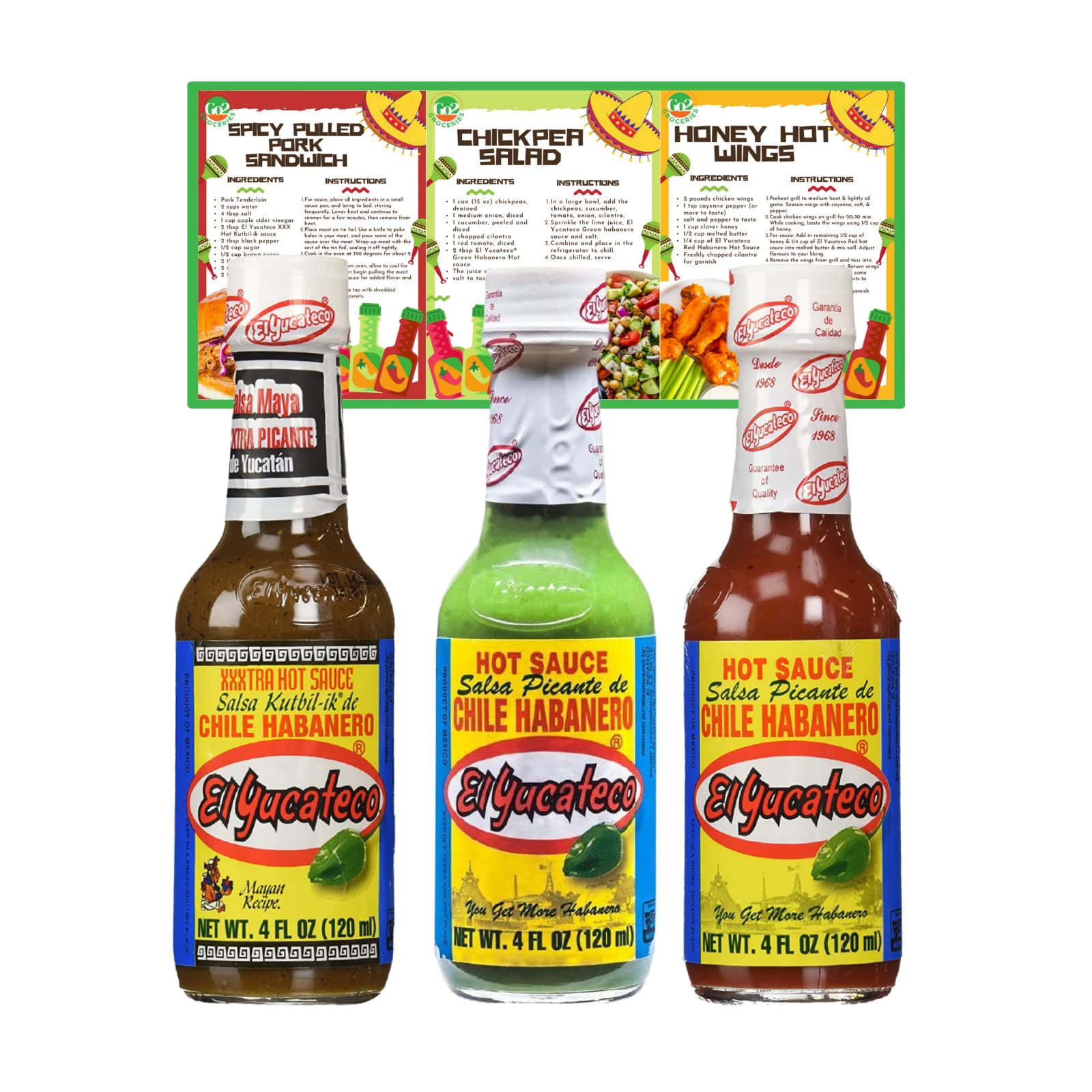 Turn up the heat in your kitchen and spice things up with El Yucateco Habanero Hot Sauces. The Green Habanero Hot Sauce, made with the freshest green peppers, garlic, and fine spices, blends into a fresh and flavorful sauce. Kutbil-Ik XXXtra Habanero Hot Sauce was inspired by the culinary traditions of the ancient Mayan civilization, hence the name "Kutbil-Ik"—a Mayan word meaning "crushed chili." Finally, Red Habanero Hot Sauce is created with our classic recipe, a blend of habanero peppers, red tomatoes, spices, and seasonings. Drizzle it over tacos, nachos, pizzas, chicken wings, grilled or barbecued meats, vegetables, fruits, salads, chips, crisps, and even your favorite cocktails. Mix it into your favorite Mexican recipes or dishes to give them an extra kick. This set also includes recipe cards with guaranteed delicious recipes to give your taste buds a party with every bite!Le lot de sauce piquante au piment contient El Yucateco Habanero vert, Salsa Kutbil-ik-de XXXTRA chaud et Habanero rouge (120 ml chacune) avec des cartes de recettesDESCRIPTION DU PRODUIT Augmentez la chaleur dans votre cuisine et pimentez les choses avec les sauces chaudes El Yucateco Habanero. La sauce piquante Habanero verte à base de poivrons verts les plus frais, d'ail et d'épices fines se fondent dans une sauce fraîche et savoureuse. Alors que la sauce Habanero chaude Kutbil-Ik XXXtra était inspirée par les traditions culinaires de l'ancienne civilisation maya, d'où le nom "Kutbil-Ik" - un mot maya signifiant "chili écrasé". Enfin, la sauce piquante Habanero rouge est créée avec notre recette classique, un mélange de poivrons habanero, de tomates rouges, d'épices et d'assaisonnements. Arrosez sur des tacos, des nachos, des pizzas, des ailes de poulet, des grillades ou des viandes grillées, des légumes, des fruits, des salades, des chips, des chips et même vos cocktails préférés. Mélangez vos recettes ou plats mexicains préférés pour lui donner un coup de pied supplémentaire. Ce lot comprend également des cartes de recettes gustatives garanties pour donner à vos papilles une fête à chaque bouchée!