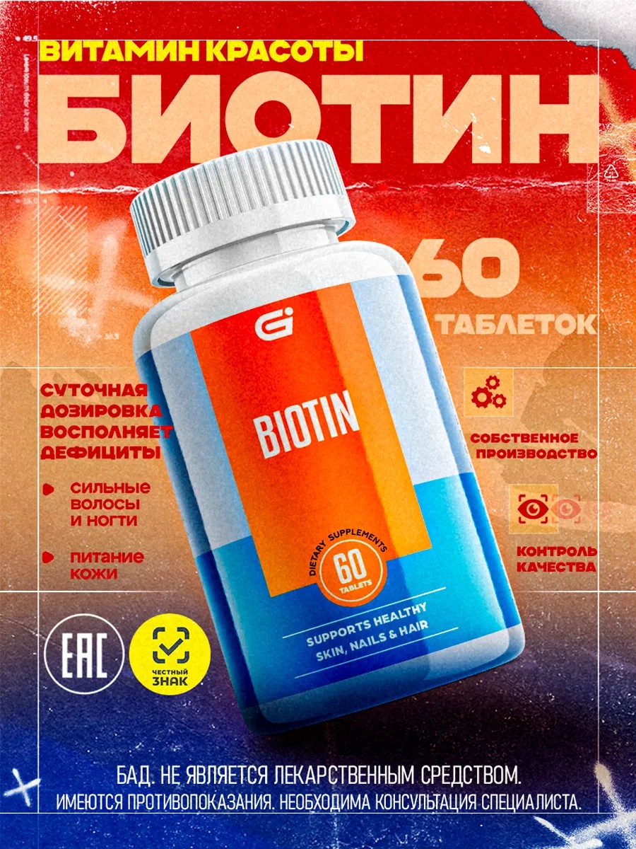 Биотин - секрет к здоровым волосам, сияющей коже и крепким ногтям. Он также известный как витамин B7 или витамин H, – это незаменимое питательное вещество, играющее ключевую роль в поддержании здоровья волос, кожи и ногтей. Его часто называют «витамином красоты» благодаря его уникальному воздействию на эти важные аспекты внешнего вида. Это один из самых важных витаминов для здоровья волос. Он непосредственно участвует в синтезе кератина – основного строительного белка волос, кожи и ногтей. Регулярное потребление биотина помогает укрепить волосяные фолликулы, стимулируя рост новых и здоровых волос. Вы заметите, что ваши волосы станут более густыми, объемными, крепкими и блестящими. Также он играет важную роль в поддержании молодости и красоты вашей кожи. Он стимулирует клеточный метаболизм, способствуя обновлению клеток кожи и предотвращая преждевременное старение. Биотин помогает бороться с различными кожными проблемами, такими как сухость, шелушение, раздражение и воспаления, улучшая эластичность и упругость кожи, делая ее более гладкой и подтянутой. Биотин – это незаменимый витамин, который играет важную роль в поддержании здоровья волос, кожи и ногтей. Его регулярное употребление, в сочетании со здоровым образом жизни и сбалансированным питанием, может значительно улучшить ваш внешний вид и общее состояние здоровья.
