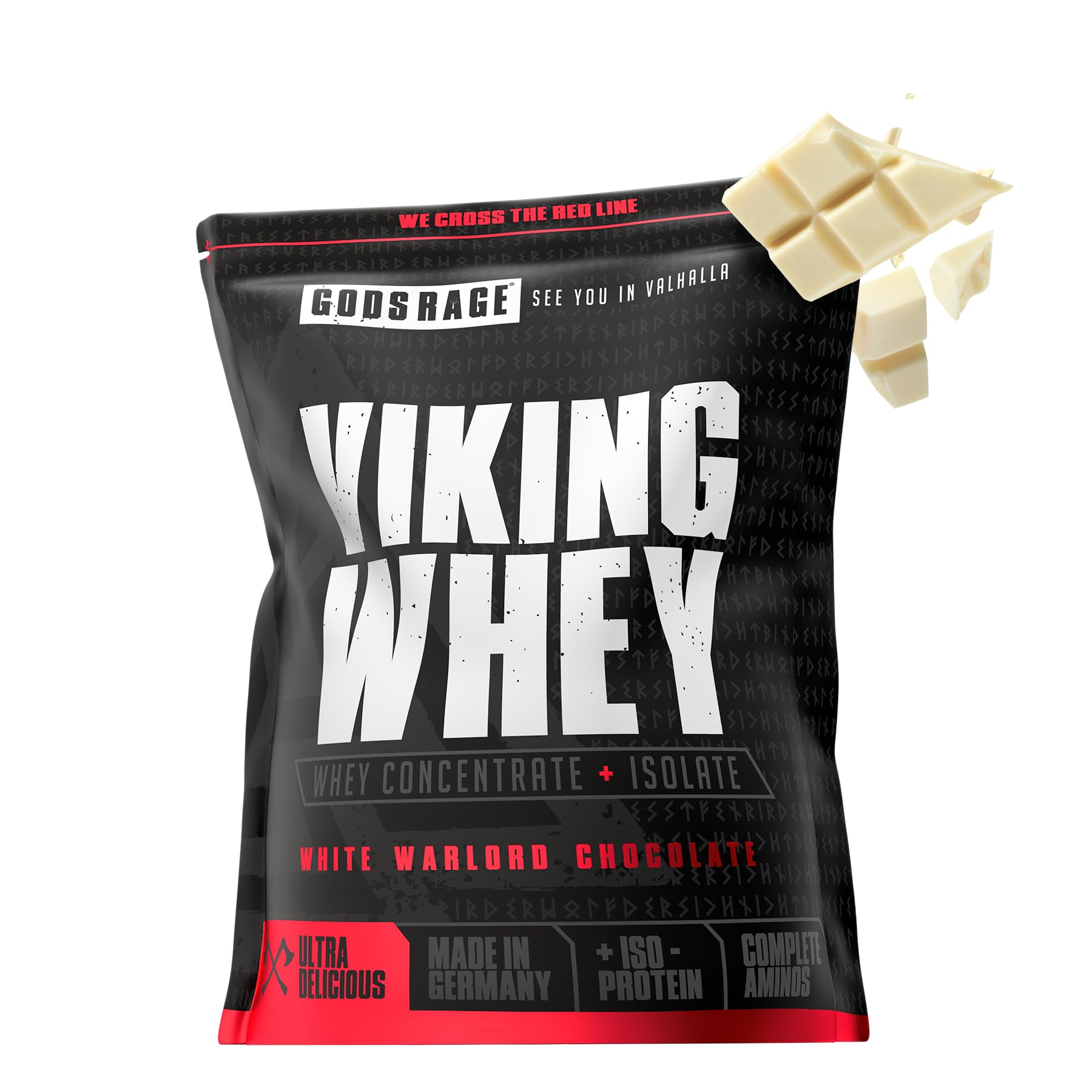 Viking Whey has enjoyed great popularity for years. This is partly due to its isolate content, which is an optimal source of protein. But it's primarily because of its taste, which is so good it will overwhelm your senses, just as it did the Vikings who once devoured it. Whey protein concentrate with 20 Cross-Flow microfiltered isolate Exceptional taste even with water. High amino acid content. Free from soy and sunflower lecithin. Aspartame-free. Proven quality - Made in Germany. Viking Whey from Gods Rage contains a top-quality whey protein concentrate as its protein source. Furthermore, its improved formula also includes a high proportion of isolate. With an above-average amino acid content and approximately 23 grams of protein per serving, Viking Whey provides ample protein to support muscle growth. It's therefore ideal for meeting your daily protein needs and taking your protein biosynthesis to the next level. Whey protein is considered one of the protein sources with the highest biological value. In addition to enhancing muscle growth, it also helps reduce muscle loss during periods of intense physical activity. Viking Whey protein is particularly bioavailable due to its high bioavailability. This ensures rapid absorption of amino acids into your bloodstream. From there, the amino acids reach your muscles via your cardiovascular system, where they are needed to build new muscle mass. With Viking Whey, you can therefore optimally supply your body with nutrients whenever your muscles need protein. This nutrient delivery benefits not only your muscle growth but also your overall recovery. INGREDIENTS Whey protein blend (ultrafiltered whey protein concentrate, microfiltered whey protein isolate), flavoring, thickener: xanthan gum, salt, sweetener: sucralose. DIRECTIONS Mix 30g (1 scoop) of Viking Whey in 250-300ml of water and enjoy. SAFETY WARNING Do not exceed the stated recommended daily intake. Food supplements should not replace a balanced and varied diet and a healthy lifestyle. Keep out of reach of children. See moreGODS RAGE Quality - Made in Germany - Purity tested - Premium protein for true warriors. Quick preparation - Ideal for shakes or porridge - Mix and go fast. Creamy and deliciously smooth consistency in flavors like chocolate, vanilla, or cinnamon - Uncompromising pleasure. No compromises - No added sugar or unnecessary fillers - Pure power for your body. ✓ POWER PROTEIN FOR TRUE FIGHTERS 23g of high-quality whey protein per serving - for strength, muscle growth, and real progress.GODSRAGE Poudre de protéines de lactosérum - 23 g de protéines fortes par portion pour le développement musculaire et la force - Crémeuse, faible en glucides, sans sucre - Protéines de qualité White Warlord ChocolateDESCRIPTION DU PRODUIT DESCRIPTION DU PRODUIT Viking Whey jouit d'une grande popularité depuis des années. Cela est dû d'une part au fait que sa teneur en isolat est une source optimale de protéines. Mais c'est surtout à cause de son goût, qui est si bon qu'il va vous voler les sens, comme les Vikings autrefois leur proie. Concentré de protéines de lactosérum avec 20 d'isolat microfiltré Cross-Flow Goût exceptionnel même avec de l'eau. Haute teneur en acides aminés. Sans lécitine de soja et de tournesol. Sans aspartame. Qualité éprouvée - Fabriqué en Allemagne. Le lactosérum Viking de Gods Rage contient un concentré de protéines de lactosérum de la plus haute qualité comme source de protéines. En outre, dans sa formule améliorée, il a également une proportion d'isolate. Avec une teneur en acides aminés supérieure à la moyenne et environ 23 grammes de protéines par portion, Viking Whey fournit suffisamment de protéines pour soutenir votre développement musculaire. Il est donc idéal pour répondre à vos besoins quotidiens en protéines et faire passer votre biosynthèse de protéines au niveau supérieur. La protéine de lactosérum est considérée comme l'une des sources de protéines ayant la plus haute valeur biologique. En plus d'une amélioration du développement musculaire, il permet également de réduire la perte musculaire en cas de forte sollicitation physique. Les protéines de lactosérum Viking sont particulièrement utilisables par le corps en raison de leur haute disponibilité biologique. Cela assure une absorption rapide des acides aminés dans votre sang. De là, les acides aminés pénètrent dans vos muscles via votre système cardiovasculaire, où ils sont nécessaires pour construire une nouvelle masse musculaire. Avec Viking Whey, vous pouvez donc fournir à votre corps des nutriments de manière optimale chaque fois que vos muscles ont besoin de protéines. Cet apport en nutriments bénéficie non seulement de votre développement musculaire, mais aussi de votre régénération en général. INGRÉDIENTS Mélange de protéines de lactosérum (concentré de protéines de lactosérum ultrafiltré, isolat de protéines de lactosérum microfiltré), arôme, épaississant : xanthane, sel, édulcorant : sucralose. MODE D'EMPLOI Mélanger 30 g (1 cuillère doseuse) de lactosérum Viking Whey dans 250-300 ml d'eau et profiter. AVERTISSEMENT DE SÉCURITÉ La quantité journalière recommandée indiquée ne doit pas être dépassée. Les compléments alimentaires ne remplacent pas une alimentation équilibrée et variée et un mode de vie sain. Tenir hors de portée des enfants. Voir plusQualité GODS RAGE - Fabriqué en Allemagne - Pureté testée - Protéines de qualité supérieure pour les vrais guerriers. Préparation rapide - Idéal pour les shakes ou les porridge - Mélangez et démarrez rapidement. Crème et délicieuse consistance crémeuse dans des saveurs telles que le chocolat, la vanille ou la cannelle – Un plaisir sans compromis. Pas de compromis - Sans sucre ajouté et sans charges inutiles - Puissance pure pour votre corps. ✓ POWER PROTEIN POUR LES VRAIS COMBATEURS 23 g de protéines de lactosérum de h