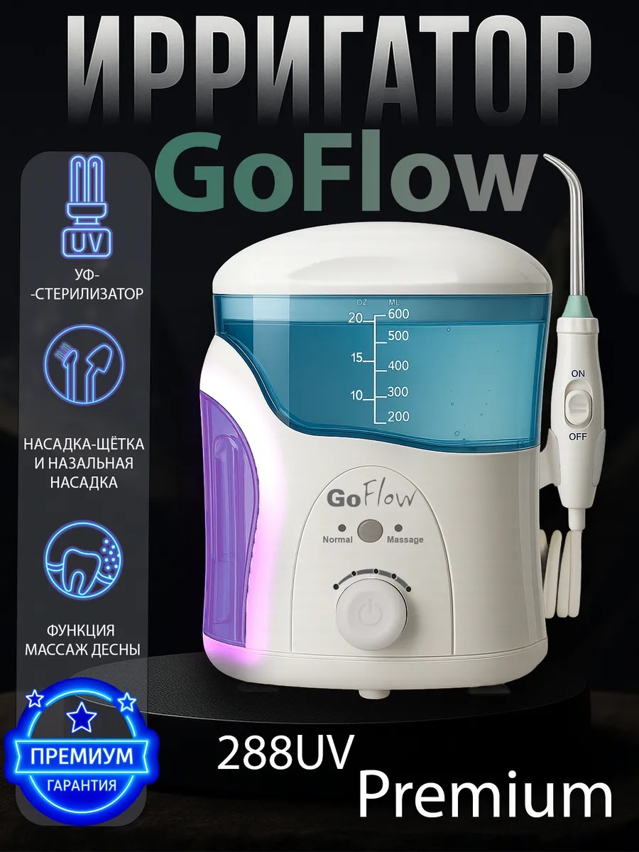 Премиальный Ирригатор GoFlow 288UV /Кварцевый обеззараживатель/Функция Массаж/9 насадок/17 скоростей/Бачок-600мл/Диапазон 210-890кПа/ ПРЕМИАЛЬНАЯ ГАРАНТИЯ (любой выявленный дефект в течение года, и мы пришлем Вам новый ирригатор к вашему дому. Все Бесплатно. Никакого ремонта. Только новые приборы. Электронное гарантийное обращение) Лучший сервис для Вас!