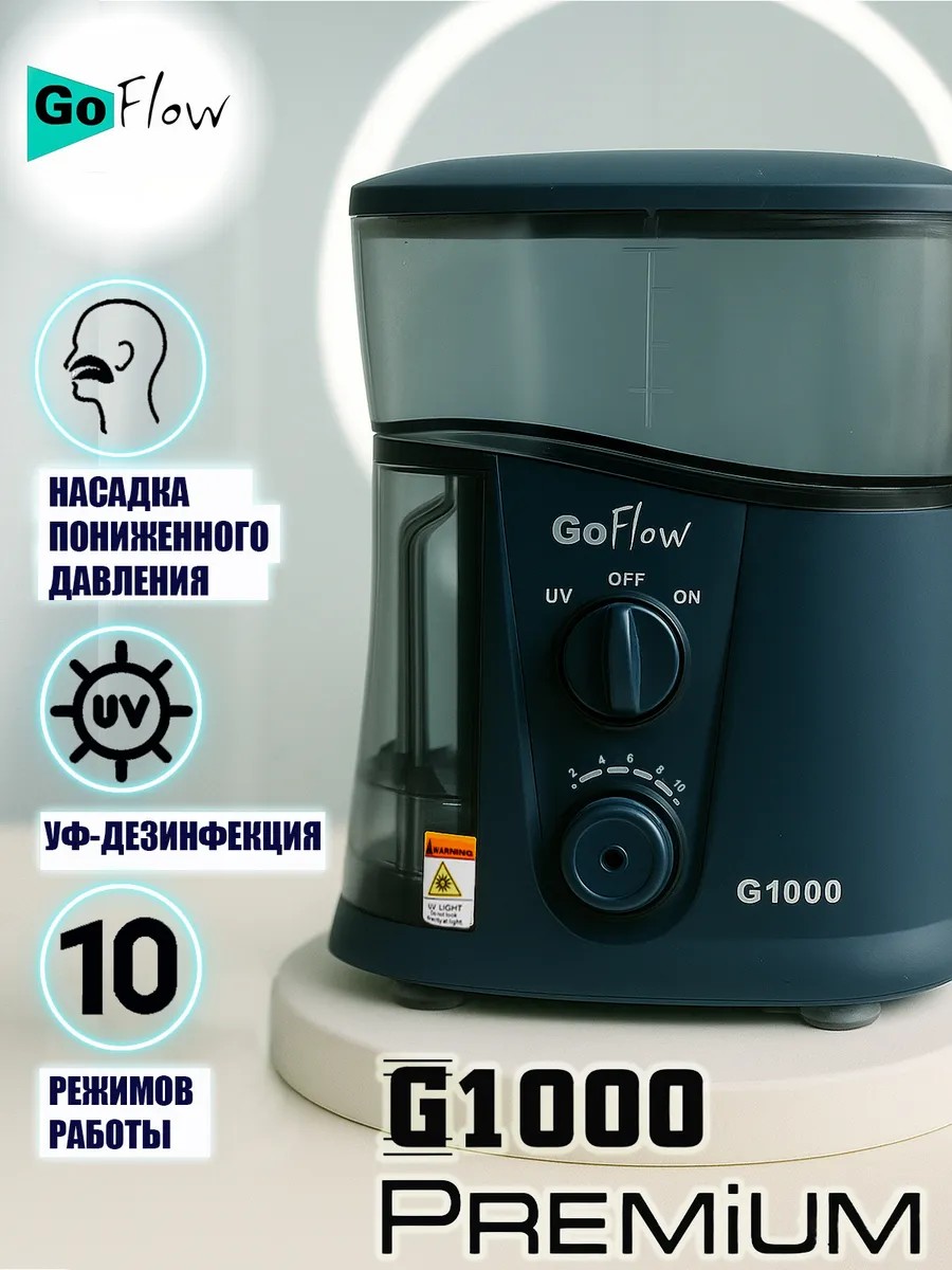 Премиальный Ирригатор GoFlow G1000 Черный цвет/Кварцевый обеззараживатель/10 насадок в т.ч. 2 низкого давления!/Диапазон чистки 20! - 890кПа/Бачок-1000мл/ПРЕМИАЛЬНАЯ ГАРАНТИЯ (любой выявленный дефект в течение года, и мы пришлем Вам новый ирригатор к вашему дому. Все Бесплатно. Никакого ремонта. Только новые приборы. Электронное гарантийное обращение) Лучший сервис для Вас!