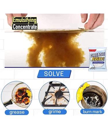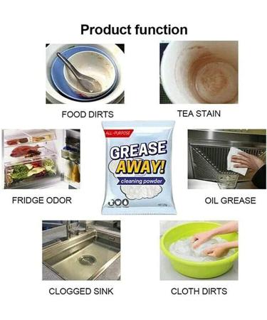 Replace The Cream CleanerIt has no irritating chemical smell and is more beneficial to the environment. Suitable to use on fabrics, canvas, finished leathers, PVCs, glass, metals and more! Suitable for kitchen, bathroom,floor,etc. Gentle NaturalInstant results without damaging the surface of the item.This Grease Away Powder Cleaner designed with no Damage Stain Remover Degreaser for Most Types of Surfaces. Safe for Families and Pet. PolishingLoss of luster will disappear immediately, leaving behind the luster.100 Damage Free, safely use on any stainless steel chrome surfaces. Deodorization DegregRubbing all the grease will come off your belongings. Neutralize alkaline odor and acid odor. Remove Dirt GrimeUse this Magical Grease Away Powder Cleaner, remove annoying grease, grime. Effectively help dirt and grease dissolve in water.