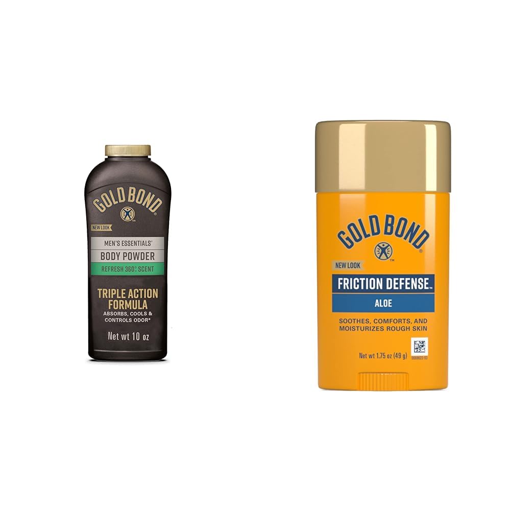 This bundle includes two Gold Bond skin care products to keep men feeling fresh. The first is a 10 oz bottle of Gold Bond Men's Essentials Talc-Free Body Powder in Refresh 360 Scent. This body powder absorbs moisture, cools skin, and controls odor and wetness caused by everyday activities like exercising. Its unique triple action formula refreshes skin with a crisp, irresistible scent. The second item is a 1.75 oz Gold Bond Friction Defense Stick. This moisturizing stick reduces skin friction and discomfort from physical activities. Its easy no-mess application soothes rough skin on the go. Together these complementary products provide wetness protection and friction relief, keeping skin comfortable in any situation. The body powder absorbs sweat to prevent odor and wetness before heading out. The friction stick then moisturizes and protects skin from chafing during activities. Men can feel cool, dry and irritation-free with this daily skin care bundle.