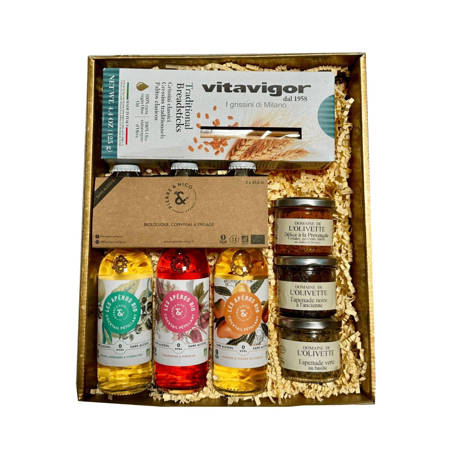 Gift boxesBreadsticks: Vitagor Traditional breadsticks: 125 gr 100 extra virgin olive oil Made in Italy. 1 Old-style Black Tapenade from DOMAINE DE L'OLIVETTE (100g) 1 Provençal Delight (tomatoes, peppers, basil) 100g from DOMAINE DE L'OLIVETTE 1 Green Tapenade with basil from DOMAINE DE L'OLIVETTE (100g). PIERRE ET NICO: MINT, GINGER LIME ALCOHOL-FREE (27.5 CL) For lovers of the freshness of peppermint, ginger and lime, discover this alcohol-free cocktail (0.0 VOL) organic made in France, full of naturalness. Like the essential Spritz Hugo, Pierre Nico have created the first French organic spritzer in an alcohol-free version, which will suit all audiences and all occasions. PIERRE ET NICO: MANGO ELDERFLOWER ALCOHOL-FREE (27.5 CL) An organic aperitif for lovers of mango and elderflower, who want to enjoy alcohol-free cocktails. Like the essential traditional Spritz Hugo cocktails, Pierre Nico have created the first organic French alcohol-free cocktail that will satisfy everyone. An explosion of flavors in an alcohol-free version (0.0 VOL). Pierre et nico: RASPBERRY HIBISCUS ALCOHOL-FREE (27.5 CL) An organic aperitif for lovers of raspberry and hibiscus who want to enjoy alcohol-free cocktails. Like the essential traditional Spritz Hugo cocktails, Pierre Nico have created the first organic French spritzer that will satisfy everyone. An explosion of flavors in an alcohol-free version (0.0 VOL). Coffrets cadeauxGressin : Vitagor Traditional breadsticks : 125 gr 100 extra vrigin olive oil Made in Italy. 1 Tapenade Noire a la ancienne du DOMAINE DE L'OLIVETTE (100g) 1 Délice à la Provençale (tomates, poivrons, basilic) de 100g du DOMAINE DE L'OLIVETTE 1 Tapenade Verte au basilic du DOMAINE DE L'OLIVETTE (100g). PIERRE ET NICO : MENTHE, GINGEMBRE CITRON VERT SANS ALCOOL (27,5 CL) Pour les amoureux de la fraîcheur de la menthe poivrée, du gingembre et du citron vert, découvrez ce cocktail sans alcool (0,0 VOL) biologiques made in France, plein de naturalité. A l'instar des incontournables Spritz Hugo, Pierre Nico signent ici le premier spritzer bio français en version sans alcool, qui conviendra à tous les publics et toutes les occasions. PIERRE ET NICO : MANGUE FLEURS DE SUREAU SANS ALCOOL (27,5 CL) Un Apéros Bio pour les amoureux de la mangue et de la fleur de sureau, qui souhaitent consommer des cocktails sans alcool. A l'instar des incontournables cocktails traditionnels Spritz Hugo, Pierre Nico signent ici le premier cocktail sans alcool bio français qui satisfera tous les publics. Une explosion de saveurs en version sans alcool (0,0 VOL). Pierre et nico : FRAMBOISE HIBISCUS SANS ALCOOL (27,5 CL) Un Apéros Bio pour les amoureux de la framboise et de l'hibiscus qui souhaitent consommer des cocktails sans alcool. A l'instar des incontournables cocktails traditionnels Spritz Hugo, Pierre Nico signent ici le premier spritzer bio français qui satisfera tous les publics. Une explosion de saveurs en version sans alcool (0,0 VOL).