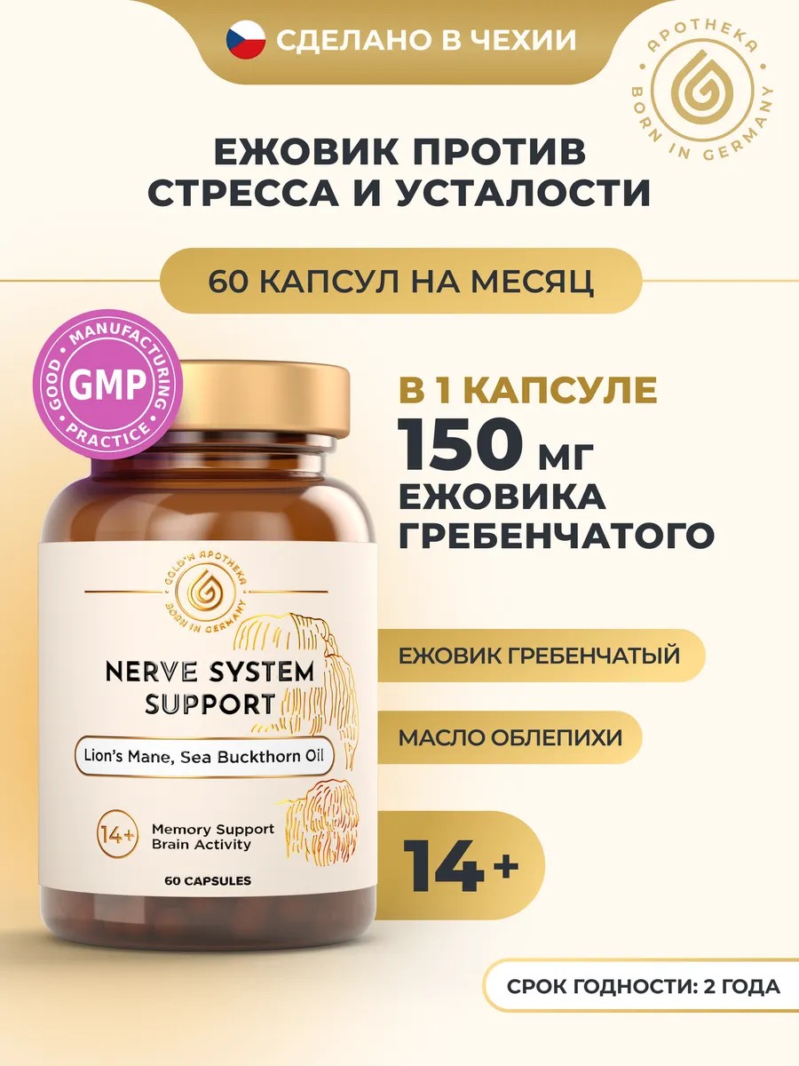 Грибной комплекс для поддержки нервов, работы мозга и памяти ноотроп Nerve System Support от премиального бренда GOLD’N APOTHEKA с порошком гриба ежовика, известного также как Львиная грива (Lion’s mane), и маслом облепихи, богатым витамином Е, способствуют повышению антиоксидантной защиты. Бета-глюканы в составе ежевика имеют иммуномодулирующие свойства для поддержания здоровья организма, в том числе в сезон простуд, содействуют улучшению работы головного мозга, нервной системы, а также полезны для сердца и сосудов, благоприятно влияют на эффективность работы пищеварительной системы. Порошок грибов в капсулах удобно принимать. Благотворно влияет на работу нервной системы (совместный прием с успокоительными средствами для сна возможен только после консультации с лечащим врачом). Пищевая добавка с бета-глюканами играет важную роль в поддержании формирования хорошего настроения, способствует уменьшению выраженности депрессии (совместный прием с антидепрессантами возможен только после консультации с лечащим врачом), дарит спокойствие и силу. Средства для энергии подходят как взрослым, так и подросткам с 14 лет. Натуральные компоненты в составе продукта способствуют укреплению иммунитета. Формула средства для мужчин и для женщин разработана для поддержки организма в период стресса и повышения работоспособности.