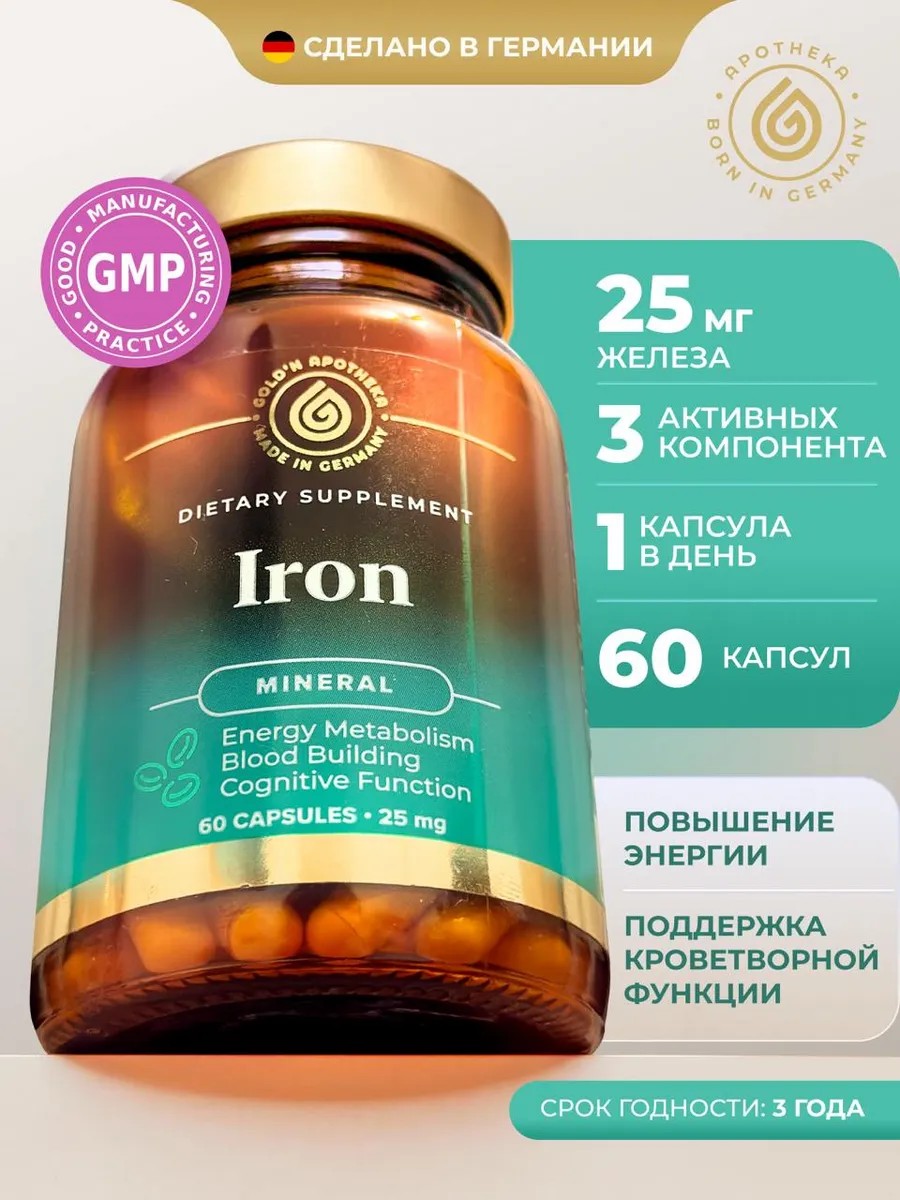 | Комплектация | GOLDN APOTHEKA (ГОЛДН АПОТЕКА) Iron (Железо) капсулы массой 394 мг, 60 шт - 1 упаковка |