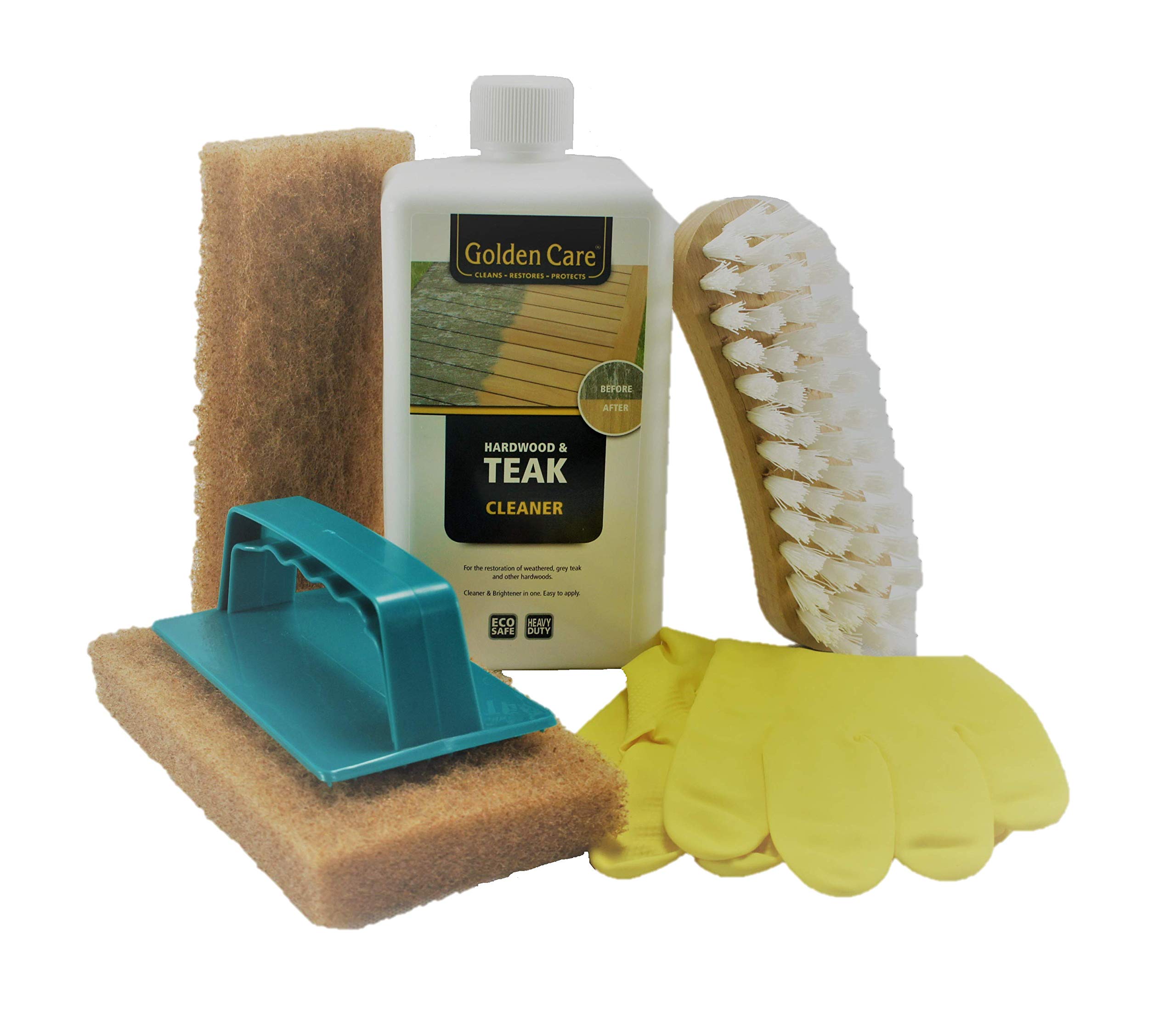 1 liter of Golden Care Teak Cleaner, 2 scouring sponges, 1 scandal brush, 1 pad holder, 1 pair of household gloves.Cleaner and brightener in one.Algae for garden furniture, terrace floors, ship deck.100% water -based;Solvent -free and 100% biodegradable.Effective cleaning, deburring and lightening for weathered and gray wood.
