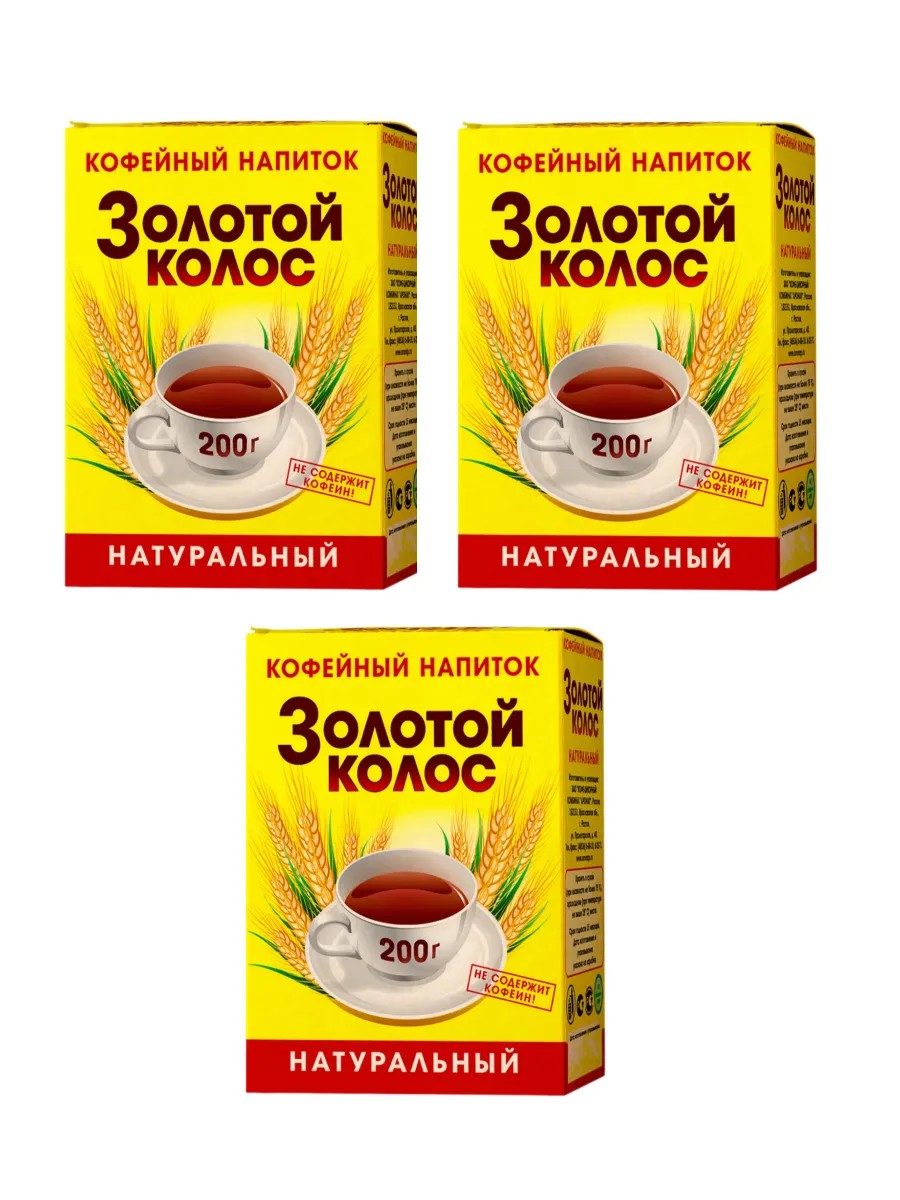 Золотой колос, Напиток кофейный порошкообразный, 3 уп по 200 гр. Кофейный напиток Золотой колос это 100% натуральный продукт, приготовленный из отборных зерен ячменя и ржи. Ячменный напиток удачно сочетает полезные свойства натуральных обжаренных хлебных злаков и насыщенный кофейный вкус напитка. Нерастворимый кофейный порошок является продуктом без кофеина, а также без сахара и без гмо.