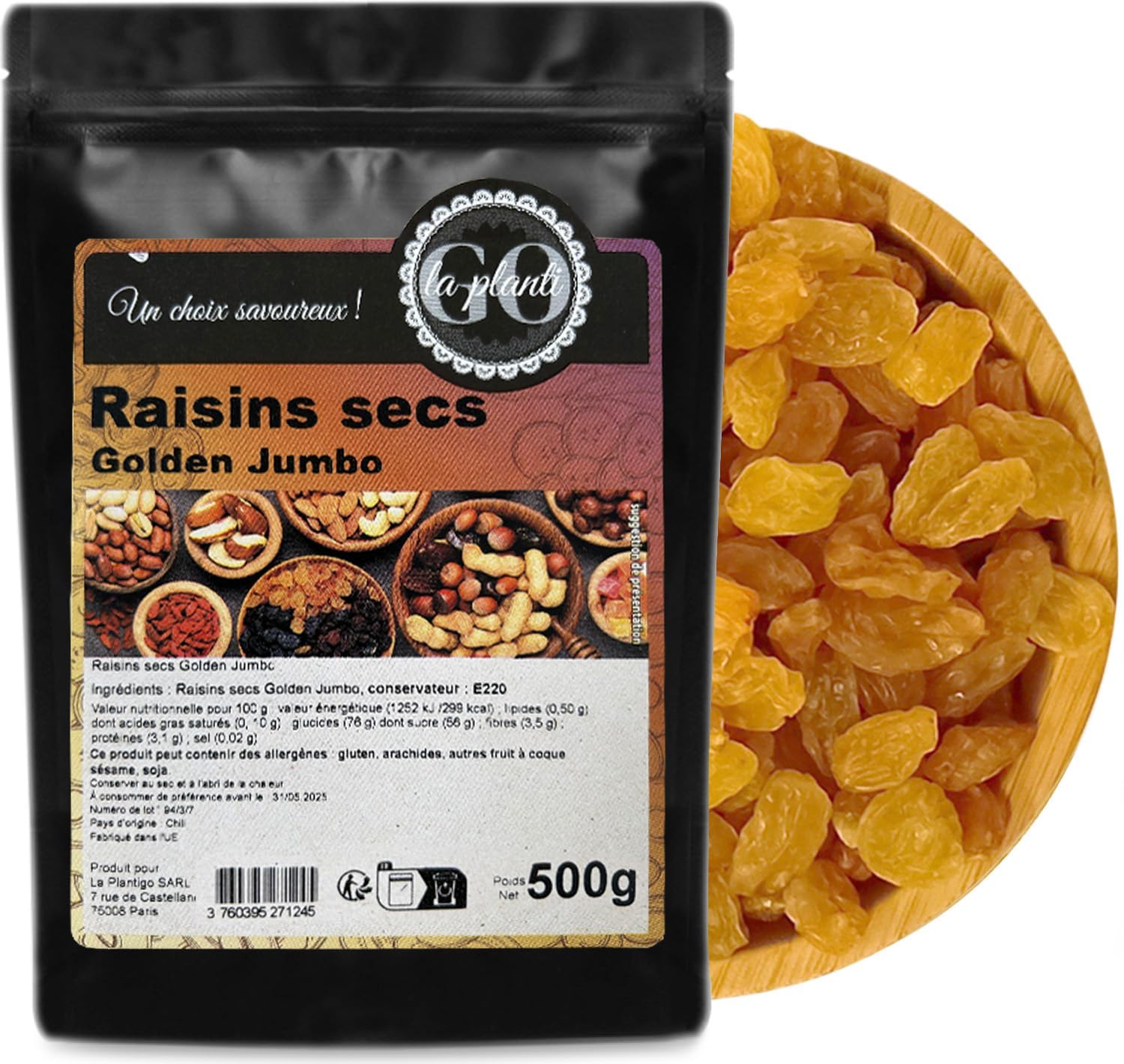 Ingredients : Golden Jumbo raisins (dried fruits from grapes), preservative: E220 Information on allergens: This product may contain allergens: gluten, peanuts, nuts, sesame, soy. Nutritional value per 100g: Energy value: 1252 kJ 299 kcal Lipids- 0.5 g Including saturated fatty acids - 0.1 g Carbohydrates- 76 g Including sugar - 56 g Fiber- 3.5 g Protein – 3.1 g Salt- 0.02 g Nutritional values were calculated from database and raw material specifications. Individual batches may vary slightly. Packaging method: The product is packaged in thick "doypack" type bags. The package has a welded drawstring closure, which allows easy opening and closing multiple times. Thanks to this simple technology, the product maintains its freshness. Its organoleptic properties do not change during the entire shelf life. Thanks to high sales volumes and the rotation of our stocks, LA PLANTIGO products are always fresh, which encourages bulk purchases and the storage of food in the pantry at home. INGREDIENTS Golden Jumbo raisins (dried fruits from grapes), preservative: E220Fresh and plump, Golden raisins added to a fruit salad will not overpower its taste but will only enhance the flavor of the other ingredients. Raisins are a delicious, nutritious, and satisfying snack, a healthy alternative to sweets. Golden Jumbo raisins are excellent in muesli, cereal, or with yogurt as a snack. Using Golden Jumbo raisins in cooking Raisins can be eaten as a delicious, nutritious snack. They are commonly used in everyday cooking as an ingredient in cakes, muffins, cookies, ice cream, desserts, toppings (e.g., for pancakes), mixed salads, raw vegetable salads, meats, and sauces. What do Golden Jumbo raisins look like? This variety is characterized by a larger size compared to classic sultanas. As their name suggests, the color of Golden raisins is light and golden, which gives them added aesthetic value and is a real culinary asset. They are appreciated by many enthusiasts, both in everyday cooking and in gastronomy. The Golden Jumbo raisin variety is characterized by its light yellow color. They are larger than classic sultana raisins. They add a delicious extra touch to your ice cream, desserts, or cakes (especially cheesecakes). They can also be delicious as a snack. Golden Jumbo raisins are dried grape fruits. They are an excellent source of nutrients, minerals, antioxidants, and vitamins. Ingrédients : Raisins secs Golden Jumbo (fruits séchés issus du raisin), conservateur : E220 Information sur allergènes : Ce produit peut contenir les allergènes : gluten, arachides, fruit à coque, sésame, soja. Valeur nutritionnelle pour 100g: Valeur énergétique: 1252 kJ 299 kcal Lipides- 0,5 g Dont acides gras saturés- 0,1 g Glucides- 76 g Dont sucre - 56 g Fibres- 3,5 g Protéines – 3,1 g Sel- 0,02 g Les valeurs nutritionnelles ont été calculées à partir de base de données et spécifications de matières premières. Les lots individuels peuvent varier légèrement. Méthode d'emballage : Le produit est emballé dans des sachets épais de type « doypack ». L'emballage a une fermeture à cordon soudé, ce qui permet l'ouverture et la fermeture facile plusieurs fois. Grâce à cette technologie simple le produit garde sa fraicheur. Ses propriétés organoleptiques ne changent pas pendant toute la durée de conservation. Grâce aux volumes de ventes important et la rotation de nos stocks, les produits LA PLANTIGO sont toujours frais, ce qui favorise les achats en gros et le stockage des aliments dans le garde-manger à la maison. INGRÉDIENTS Raisins secs Golden Jumbo (fruits séchés issus du raisin), conservateur : E220Frais et charnus, les raisins secs Golden ajoutés à une salade de fruits ne domineront pas son goût mais rehausseront seulement la saveur des autres ingrédients. Les raisins secs sont un succulent en-cas nutritif et rassasiant, constituant une alternative saine aux sucreries. Les raisins secs Golden Jumbo sont excellents dans les mueslis, les céréales ou avec du yaourt, en tant que collation. Utilisation des raisins secs Golden Jumbo en cuisine Les raisins secs peuvent être consommés comme un délicieux en-cas nutritif. Ils sont communément utilisés dans la cuisine de tous les jours comme ingrédient des gâteaux, muffins, biscuits, glaces, desserts, garnitures (par exemple pour les crêpes), salades composées, salades de crudités, viandes et sauces. À quoi ressemblent les raisins secs Golden Jumbo ? Cette variété se caractérise par une taille plus grande par rapport aux raisins secs sultanines classiques. Comme leur nom l'indique, la couleur des raisins secs Golden est claire et dorée, ce qui leur confère une valeur esthétique supplémentaire et constitue un vrai atout culinaire. Ils sont appréciés par de nombreux amateurs, aussi bien dans la cuisine de tous les jours que dans la gastronomie. La variété de raisins secs Golden Jumbo se caractérise par sa couleur jaune clair. Ils sont plus grands que les raisins secs sultanines classiques. Ils apportent une touche supplémentaire délicieuse à vos glaces, desserts ou gâteaux (notamment les cheesecakes). Ils peuvent être également succulents comme en-cas. Les raisins secs Golden Jumbo sont des fruits séchés de raisin. Ils constituent une excellente source de nutriments, de minéraux, d'antioxydants et de vitamines.