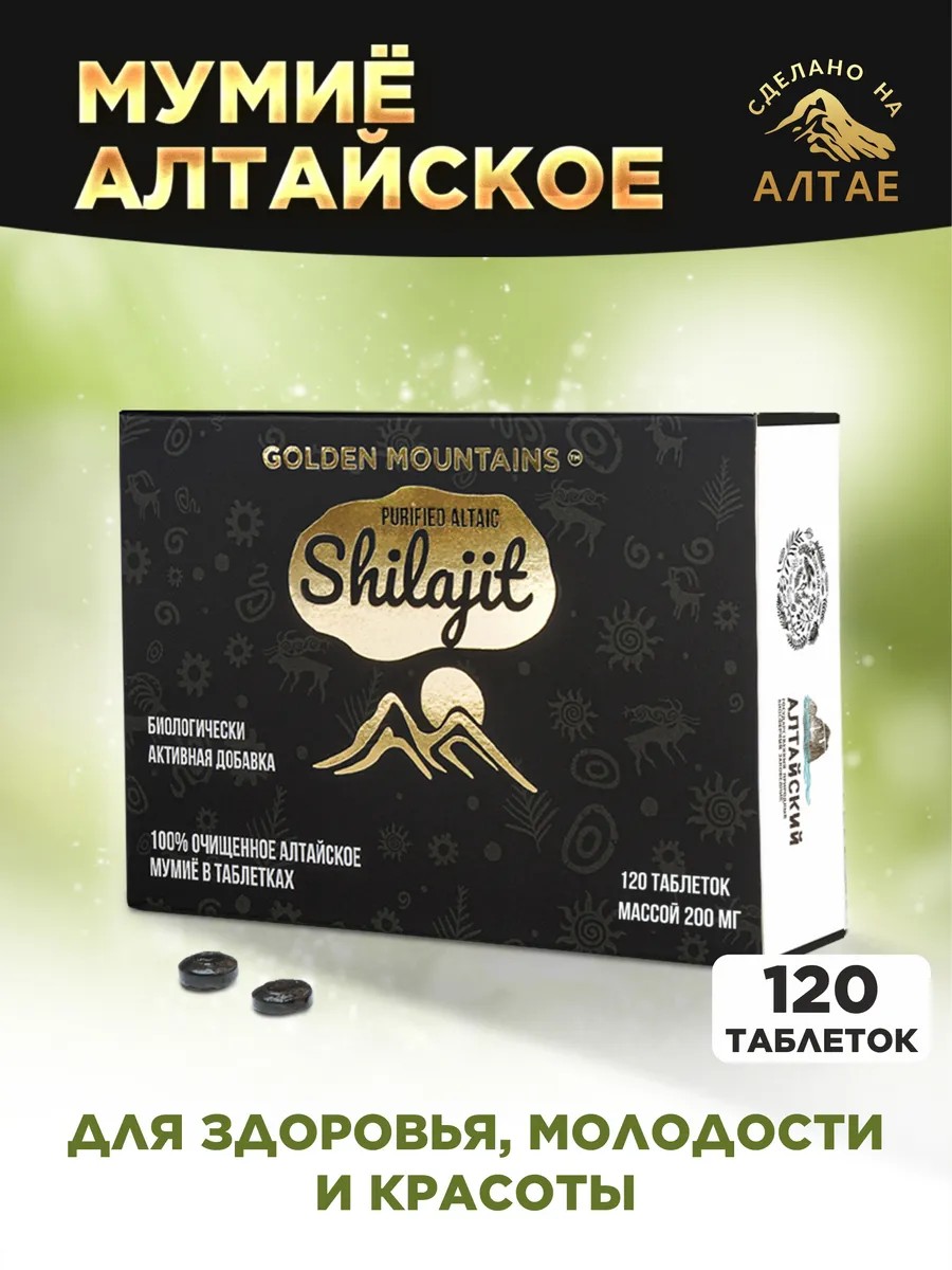 Мумие в таблетках 120 шт. Мумиё – это целебный и уникальный продукт, созданный самой природой. Алтайское мумие представляет собой комплекс минерально-органических веществ, витаминов, эфирных масел, белков, аминокислот, макро- и микроэлементов, липидов, жирных кислот и антиоксидантов, целебные свойства которых обусловлены высокой биодоступностью. Эта пищевая витаминная добавка является природным биостимулятором, которая возвращает здоровье, силу, молодость и наполняет организм энергией и бодростью. Применяется при упадке сил и стрессах, переломах, язвах, для улучшения обменных процессов, для борьбы с воспалениями и кожными заболеваниями. Горное мумие - природный бальзам, для его образования требуется сочетание определённых условий: органика, горы, свежий чистый воздух и очень много времени. Это природное лекарство для суставов имеет специфический запах, чёрный или темно-коричневый цвет, горький вкус, хорошо растворяется в воде. В натуральное мумие никаких дополнительных компонентов не добавляется. Можно встретить иное название - шиладжит или горный воск, также используют определение алтайское золотое мумие, что подчеркивает высокую ценность горного бальзама. Мумие алтайское представляет собой спрессованную минеральную глину природного происхождения, напоминающую смолу, может выпускаться в виде пасты, также выпускают мумие в капсулах, а таблетки являются одной из популярных форм производства так как удобны в ежедневном использовании и также, как и паста, могут быть растворены в жидкости. Мумие содержит около 50 биологических элементов, в число которых входят глицин, метионин, триптофан и лизин, минералы (калий, магний, хром, медь, железо, сера, селен), жирные кислоты (олеиновая, линолевая, линоленовая и др), смолы, флавоноиды, провитамин А, витамины Е, С, Р и витамины группы В, органические кислоты (гиппуровая, бензойная, янтарная, лимонная, щавелевая, винная и др). Оздоровительное свойство мумиё связано с высоким содержанием гуминовых кислот, которые практически не поступают в организм человека с пищей. Гуминовые кислоты - мощные антиоксиданты, которые очищают организм от продуктов распада, связывают и выводят соли тяжёлых металлов, радиоактивные вещества, яды и восстанавливают внутреннюю среду организма. Аминокислоты, входящие в состав, отвечают за состав синтез белков и стимулируют организм вырабатывать коллаген, тем самым оказывают омолаживающее действие и позволяют сохранить молодость и красоту . Гиппуровая кислота убивает болезнетворную микрофлору. Камедь и смолы обеспечивают правильную работу ЖКТ. Железо отвечает за качественный состав крови, а флавоноиды снимают воспаление, укрепляют сердце и сосуды. Чаще всего мумие растворяют в воде и пьют, но также используют как БАД к пище. Для получения целебного напитка, который обеспечивает комплексное очищение организма, мумие растворяют в жидкости в соотношении 3 г на 350 мл. В сочетании с соком и тёртым имбирём обеспечивается прекрасный жиросжигающий эффект, такой детокс для похудения действует как сжигатель жира и притупляет чувство голода. Мумие в таблетках или капсулах применяют по одной 3 раза в день, витаминная добавка восполняет дефицит биологически активных веществ и применяется в комплексном лечении артрита, артроза, ревматизма, атеросклероза, варикоза, п
