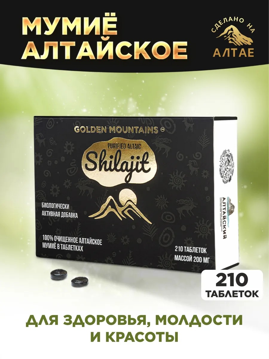 Мумие в таблетках 210 шт. Мумиё – это целебный и уникальный продукт, созданный самой природой. Алтайское мумие представляет собой комплекс минерально-органических веществ, витаминов, эфирных масел, белков, аминокислот, макро- и микроэлементов, липидов, жирных кислот и антиоксидантов, целебные свойства которых обусловлены высокой биодоступностью. Эта пищевая витаминная добавка является природным биостимулятором, которая возвращает здоровье, силу, молодость и наполняет организм энергией и бодростью. Применяется при упадке сил и стрессах, переломах, язвах, для улучшения обменных процессов, для борьбы с воспалениями и кожными заболеваниями. Горное мумие - природный бальзам, для его образования требуется сочетание определённых условий: органика, горы, свежий чистый воздух и очень много времени. Это природное лекарство для суставов имеет специфический запах, чёрный или темно-коричневый цвет, горький вкус, хорошо растворяется в воде. В натуральное мумие никаких дополнительных компонентов не добавляется. Можно встретить иное название - шиладжит или горный воск, также используют определение алтайское золотое мумие, что подчеркивает высокую ценность горного бальзама. Мумие алтайское представляет собой спрессованную минеральную глину природного происхождения, напоминающую смолу, может выпускаться в виде пасты, также выпускают мумие в капсулах, а таблетки являются одной из популярных форм производства так как удобны в ежедневном использовании и также, как и паста, могут быть растворены в жидкости. Мумие содержит около 50 биологических элементов, в число которых входят глицин, метионин, триптофан и лизин, минералы (калий, магний, хром, медь, железо, сера, селен), жирные кислоты (олеиновая, линолевая, линоленовая и др), смолы, флавоноиды, провитамин А, витамины Е, С, Р и витамины группы В, органические кислоты (гиппуровая, бензойная, янтарная, лимонная, щавелевая, винная и др). Оздоровительное свойство мумиё связано с высоким содержанием гуминовых кислот, которые практически не поступают в организм человека с пищей. Гуминовые кислоты - мощные антиоксиданты, которые очищают организм от продуктов распада, связывают и выводят соли тяжёлых металлов, радиоактивные вещества, яды и восстанавливают внутреннюю среду организма. Аминокислоты, входящие в состав, отвечают за состав синтез белков и стимулируют организм вырабатывать коллаген, тем самым оказывают омолаживающее действие и позволяют сохранить молодость и красоту . Гиппуровая кислота убивает болезнетворную микрофлору. Камедь и смолы обеспечивают правильную работу ЖКТ. Железо отвечает за качественный состав крови, а флавоноиды снимают воспаление, укрепляют сердце и сосуды. Чаще всего мумие растворяют в воде и пьют, но также используют как БАД к пище. Для получения целебного напитка, который обеспечивает комплексное очищение организма, мумие растворяют в жидкости в соотношении 3 г на 350 мл. В сочетании с соком и тёртым имбирём обеспечивается прекрасный жиросжигающий эффект, такой детокс для похудения действует как сжигатель жира и притупляет чувство голода. Мумие в таблетках или капсулах применяют по одной 3 раза в день, витаминная добавка восполняет дефицит биологически активных веществ и применяется в комплексном лечении артрита, артроза, ревматизма, атеросклероза, варикоза, п