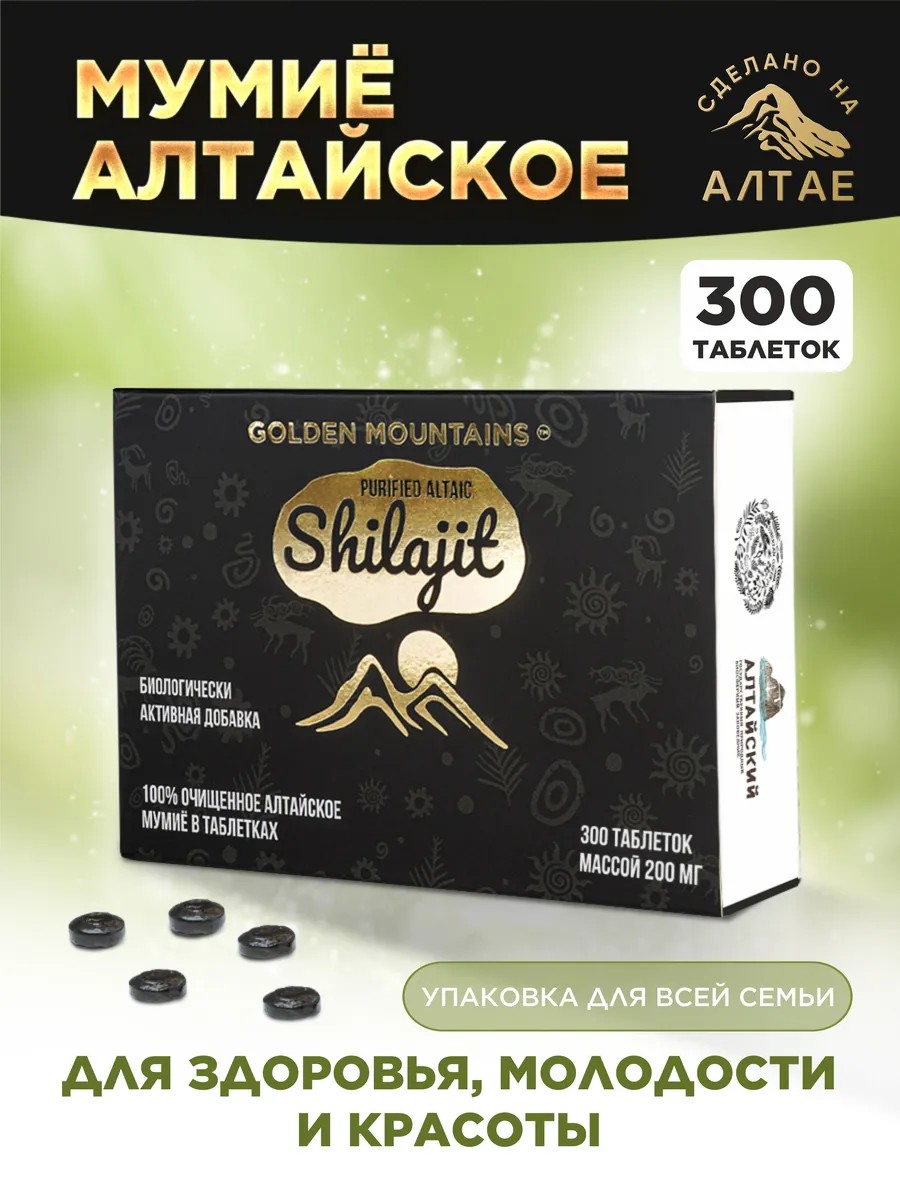 Мумие в таблетках 300 шт. Мумиё – это целебный и уникальный продукт, созданный самой природой. Алтайское мумие представляет собой комплекс минерально-органических веществ, витаминов, эфирных масел, белков, аминокислот, макро- и микроэлементов, липидов, жирных кислот и антиоксидантов, целебные свойства которых обусловлены высокой биодоступностью. Эта пищевая витаминная добавка является природным биостимулятором, которая возвращает здоровье, силу, молодость и наполняет организм энергией и бодростью. Применяется при упадке сил и стрессах, переломах, язвах, для улучшения обменных процессов, для борьбы с воспалениями и кожными заболеваниями. Горное мумие - природный бальзам, для его образования требуется сочетание определённых условий: органика, горы, свежий чистый воздух и очень много времени. Это природное лекарство для суставов имеет специфический запах, чёрный или темно-коричневый цвет, горький вкус, хорошо растворяется в воде. В натуральное мумие никаких дополнительных компонентов не добавляется. Можно встретить иное название - шиладжит или горный воск, также используют определение алтайское золотое мумие, что подчеркивает высокую ценность горного бальзама. Мумие алтайское представляет собой спрессованную минеральную глину природного происхождения, напоминающую смолу, может выпускаться в виде пасты, также выпускают мумие в капсулах, а таблетки являются одной из популярных форм производства так как удобны в ежедневном использовании и также, как и паста, могут быть растворены в жидкости. Мумие содержит около 50 биологических элементов, в число которых входят глицин, метионин, триптофан и лизин, минералы (калий, магний, хром, медь, железо, сера, селен), жирные кислоты (олеиновая, линолевая, линоленовая и др), смолы, флавоноиды, провитамин А, витамины Е, С, Р и витамины группы В, органические кислоты (гиппуровая, бензойная, янтарная, лимонная, щавелевая, винная и др). Оздоровительное свойство мумиё связано с высоким содержанием гуминовых кислот, которые практически не поступают в организм человека с пищей. Гуминовые кислоты - мощные антиоксиданты, которые очищают организм от продуктов распада, связывают и выводят соли тяжёлых металлов, радиоактивные вещества, яды и восстанавливают внутреннюю среду организма. Аминокислоты, входящие в состав, отвечают за состав синтез белков и стимулируют организм вырабатывать коллаген, тем самым оказывают омолаживающее действие и позволяют сохранить молодость и красоту . Гиппуровая кислота убивает болезнетворную микрофлору. Камедь и смолы обеспечивают правильную работу ЖКТ. Железо отвечает за качественный состав крови, а флавоноиды снимают воспаление, укрепляют сердце и сосуды. Чаще всего мумие растворяют в воде и пьют, но также используют как БАД к пище. Для получения целебного напитка, который обеспечивает комплексное очищение организма, мумие растворяют в жидкости в соотношении 3 г на 350 мл. В сочетании с соком и тёртым имбирём обеспечивается прекрасный жиросжигающий эффект, такой детокс для похудения действует как сжигатель жира и притупляет чувство голода. Мумие в таблетках или капсулах применяют по одной 3 раза в день, витаминная добавка восполняет дефицит биологически активных веществ и применяется в комплексном лечении артрита, артроза, ревматизма, атеросклероза, варикоза, п