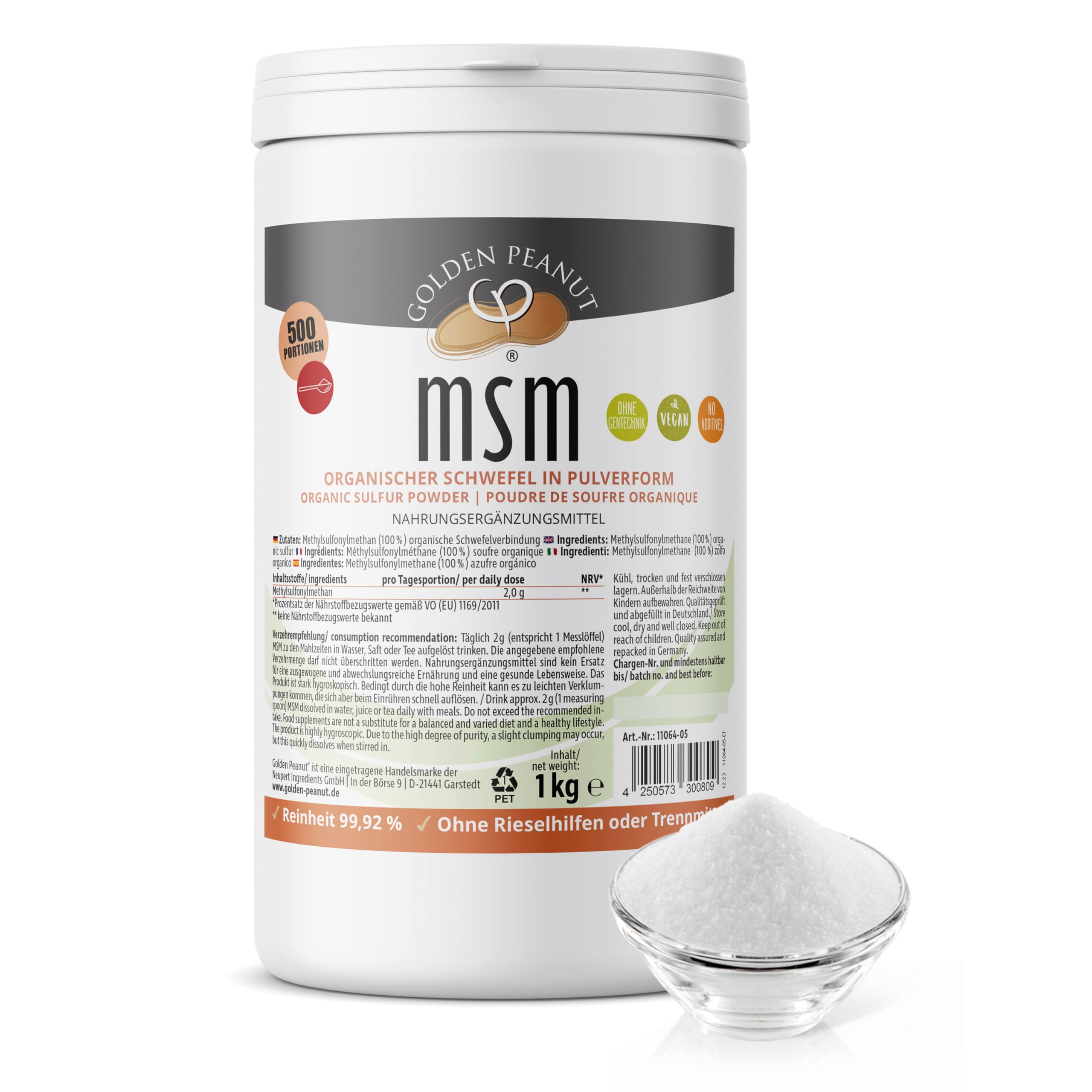 Ingredients: Methyl sulfonylmethane (100 %) Advantages: * suitable for humans and animals * Food quality * Organic origin * highest purity 99.92 % * without artificial trickle aids * Aromasproat and food -safe packaging * bottled in Germany Instructions for use: MSM is the abbreviation for methylsulfonylmethane.The fabric belongs to the group of organic sulfur compounds (sulfone).Methyl sulfonylmethane can also be found in vegetable but also in animal products.In relatively large quantities, for example, it is contained in milk, onions, sauerkraut and coffee. The absorption of organic sulfur forms enzymes and amino acids.MSM is a central component of glutathione, which is one of the most important body -own antioxidants.We take up MSM with our daily food, which is often destroyed by cooking, so that only small quantities arrive in the body and can be processed there.Spliss, fragile nails and joint pain can be a sign of a deficiency. Eat 0.5 - 4 g MSM every day.The specified recommended consumption of consumption should not be exceeded.Golden Peanut MSM powder is also suitable for animals, especially dogs, cats and horses. The purity degree of MSM is important.There are many products offered that are enriched with fillers or trickle aids.Golden Peanut MSM has a very high degree of purity of at least 99.92%.It is a high -purity product without additives.Please note that products that are offered without a trickle aid have a higher purity but tend to clump. Ingredients / ingredients MSM Instructions MSM methylsulfonylmethan powder eat 0.5 - 4 g MSM every day.The powder can be stirred into water, juice, yogurt, ice cream and cold dishes.The amount should not be exceeded. Address manufacturer/importer Neupert Ingredients, in Börse 9, 21441 Garstedt More Quality Made in Germany: The Golden Peanut product line is developed and produced in Germany according to the strictest quality criteria - our company is certified according to IFS, organic and HACCP, all raw materials are examined in accredited German laboratories.The environmentally friendly packaging is aromatic and ensures long durability.Recommendation for consumption: drink 2 g (corresponds to 1 measuring spoon) msm with meals in water, juice or tea dissolved.The specified recommended consumption of consumption must not be exceeded.Dietary supplements are not a substitute for a balanced and varied diet and a healthy lifestyle.Highest purity: On the contrary, Golden Peanut MSM has a very high degree of purity of at least 99.92%.It is a high -purity product without additives or artificial, added trickle aids.Methyl sulfonylmethane: MSM belongs to the group of organic sulfur compounds (sulfone).It can be found in vegetable and animal products and we absorb it through our food such as milk, onions, sauerkraut.Organic sulfur in powder form is a very popular dietary supplement that can be taken daily. Zutaten: Methylsulfonylmethan (100 %) Vorteile: * für Mensch und Tier geeignet * Lebensmittelqualität * organischer Ursprung * höchste Reinheit 99,92 % * ohne künstliche Rieselhilfen * aromasichere und lebensmittelechte Verpackung * in Deutschland abgefüllt Gebrauchsanweisung: MSM ist die Abkürzung für Methylsulfonylmethan. Der Stoff gehört zur Gruppe der organischen Schwefelverbindungen (Sulfone). Methylsulfonylmethan ist in pflanzlichen aber ebenso in tierischen Produkten zu finden. In relativ großer Menge ist es beispielsweise in Milch, Zwiebeln, Sauerkraut und Kaffee enthalten. Durch die Aufnahme von organischem Schwefel werden Enzyme und Aminosäuren gebildet. MSM ist ein zentraler Baustein von Glutathion, welches eines der wichtigsten körpereigenen Antioxidantien ist. Wir nehmen mit unserer täglichen Nahrung MSM auf, das aber durch Kochen häufig zerstört wird, sodass nur Kleinstmengen im Körper ankommen und dort verarbeitet werden können. Spliss, brüchige Nägel und Gelenkschmerzen können Anzeichen für eine Mangelerscheinung sein. Täglich 0,5 - 4 g MSM verzehren. Die angegebene empfohlene Verzehrmenge soll nicht überschritten werden. Auch für Tiere, insbesondere Hunde, Katzen und Pferde ist Golden Peanut MSM Pulver geeignet. Wichtig ist der Reinheitsgrad von MSM. Es werden viele Produkte angeboten die mit Füllstoffen oder Rieselhilfen angereichert sind. Golden Peanut MSM hat einen sehr hohen Reinheitsgrad von mindestens 99,92%. Es handelt sich um ein hochreines Produkt ohne Zusätze. Bitte beachten Sie, dass Produkte, die ohne Rieselhilfen angeboten werden zwar eine höhere Reinheit haben, aber zu Verklumpungen neigen. INHALTSSTOFFE / ZUTATEN MSM GEBRAUCHSANWEISUNG MSM Methylsulfonylmethan Pulver täglich 0,5 - 4 g MSM verzehren. Das Pulver lässt sich in Wasser, Saft, Joghurt, Eis und Kaltspeisen gut einrühren. Die Menge sollte nicht überschritten werden. ANSCHRIFT HERSTELLER/IMPORTEUR Neupert Ingredients, In der Börse 9, 21441 Garstedt MehrQUALITÄT MADE IN GERMANY: Die Golden Peanut Produktlinie wird in Deutschland nach strengsten Qualitätskriterien entwickelt und produziert – unser Betrieb ist zertifiziert nach IFS, Bio und HACCP, alle Rohstoffe werden in akkreditierten deutschen Laboren untersucht. Die umweltfreundliche Verpackung ist aromasicher und sorgt für eine lange Haltbarkeit. VERZEHREMPFEHLUNG: Täglich 2 g (entspricht 1 Messlöffel) MSM zu den Mahlzeiten in Wasser, Saft oder Tee aufgelöst trinken. Die angegebene empfohlene Verzehrmenge darf nicht überschritten werden. Nahrungsergänzungsmittel sind kein Ersatz für eine ausgewogene und abwechslungsreiche Ernährung und eine gesunde Lebensweise. HÖCHSTE REINHEIT: Golden Peanut MSM hat im Gegenteil zu anderen Produkten einen sehr hohen Reinheitsgrad von mindestens 99,92%. Es handelt sich um ein hochreines Produkt ohne Zusätze oder künstlich, zugefügten Rieselhilfen. METHYLSULFONYLMETHAN: MSM gehört zur Gruppe der organischen Schwefelverbindungen (Sulfone). Es ist in pflanzlichen sowie tierischen Produkten zu finden und wir nehmen es über uns