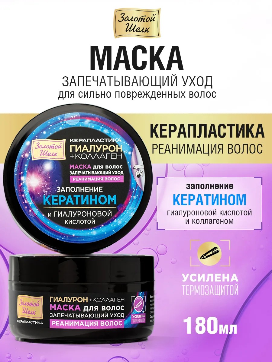 Специальная технология «Save Keratin» на основе жидкого кератина, гиалуроновой кислоты и коллагена обеспечивает сохранение целостности поврежденных участков кутикулы волоса, укрепляя и уплотняя его структуру. Способствует запуску процесса восстановления и сохранения естественного кератинового покрытия. Кератин для волос — самый важный протеин кожи и волос, из него на 75-80% состоит человеческий волос. Кератин работает как «заплатка» и помогает восстановить структуру волос. Гиалуроновая кислота это — «магнит для жидкости». Наполняет волосы влагой, питает и увлажняет кожу головы, способствует укреплению структуры волос, предотвращает сухость и ломкость. Маска для волос с кератином делает волосы здоровыми, красивыми и блестящими. Коллаген — «главный хранитель» прочности кожи. Укрепляет волосяные луковицы, а также волосы по всей длине. Маска для волос профессиональная, её легкая текстура легко смывается, не утяжеляя волосы и не оставляя жирной и липкой пленки. Маски для волос Золотой Шелк направлены на восстановление сухих и сильно повреждённых волос. Косметика для волос марки ЗОЛОТОЙ ШЕЛК волосы становятся гладкими, приобретают природное сияние, здоровый блеск и легко расчёсываются.