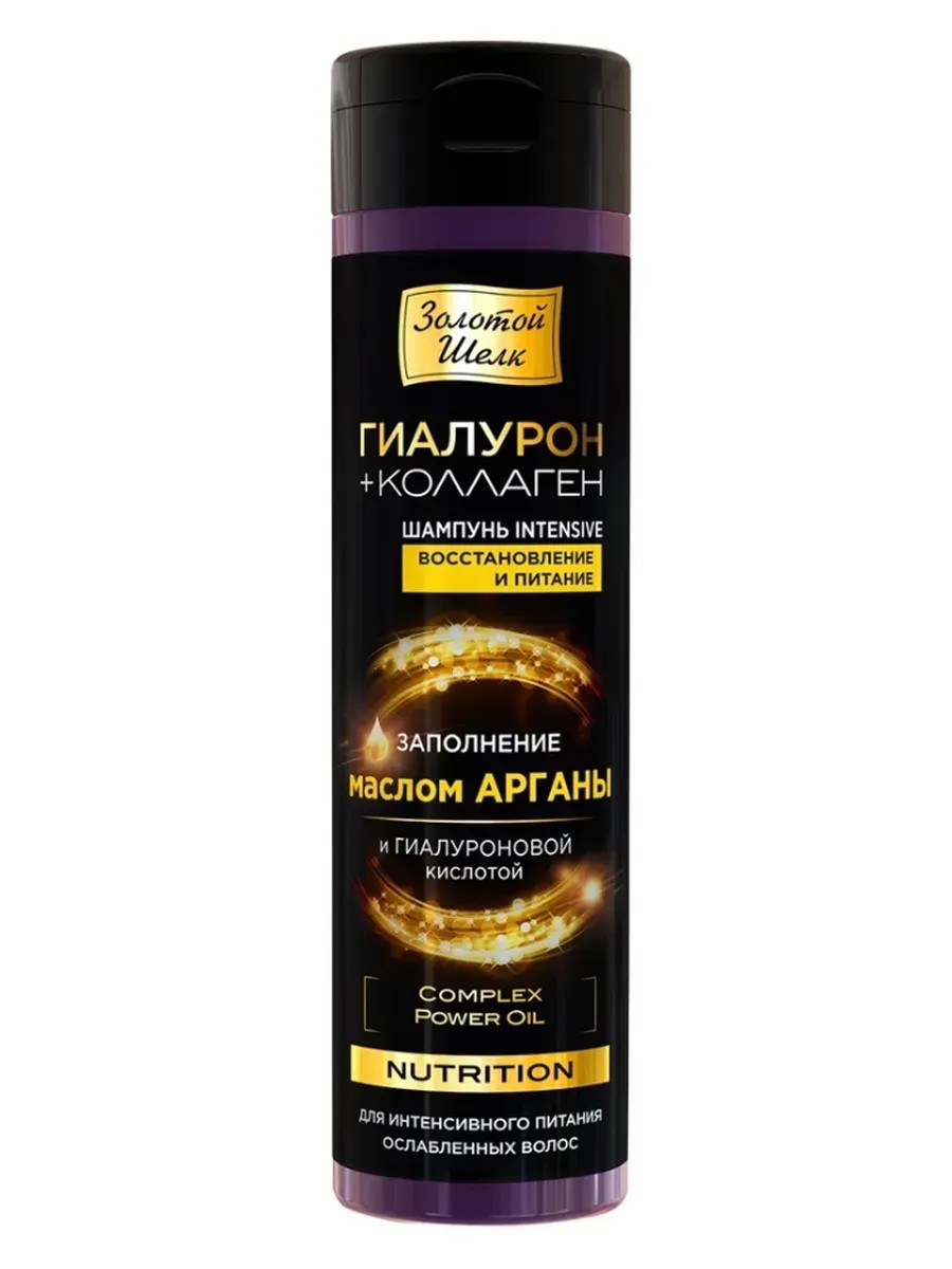 Золотой шелк шампунь intensive nutrition восстановление и питание рпзработан для интенсивного питания ослабленных волос. Сбалансированный комплекс «Power Oil» на основе ценнейшего масла Арганы, гиалуроновой кислоты и коллагена направлен на глубокое восстановление, интенсивное увлажнение тонких и ослабленных волос, заполняет пористую поверхность волосяного стержня, сохраняет структурные компоненты внутри волоса, восполняет нехватку прочности и эластичности. Волосы становятся мягкими и ухоженными, легко расчесываются, обретают жизненную силу, эластичность и здоровый блеск. Коллаген- «главный хранитель» прочности кожи, укрепляет волосяные луковицы, способствует склеиванию поврежденных и секущиеся кончиков волос, защищая их от преждевременной ломкости. Шампунь подходит для волос всех типов.