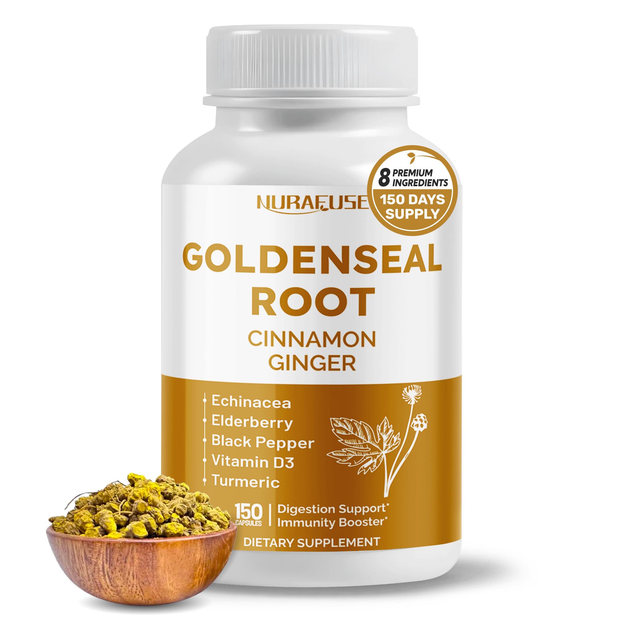 Vitamin D3, Goldenseal Root, Ceylon Cinnamon, Echinacea, Elderberry, Ginger, Turmeric, and Black Pepper. Overall Well-being Advantage: This supplement is suitable for both men and women, aids respiratory function, supports digestion, enhances the immune system, and maintains gut balance. Convenient Capsules: Nurafuse Goldenseal capsules are easy to swallow with no aftertaste; each bottle contains 150 capsules, offering a 5-month supply for added convenience.