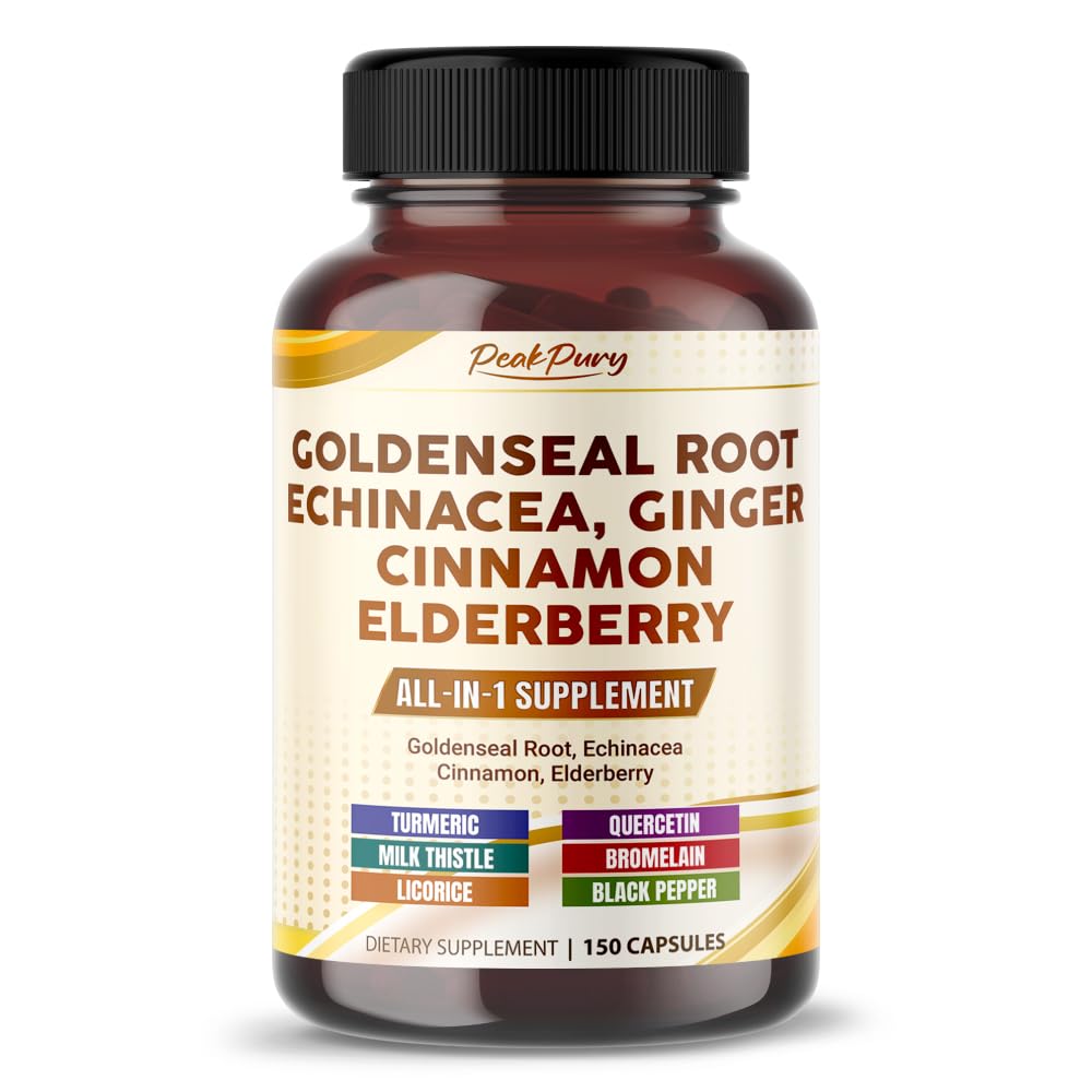 Setting An Exceptional Standard: This product is crafted from premium ingredients in a cGMP-compliant facility and undergoes rigorous third-party testing to ensure ingredient quality. 100 Natural: Each ingredient in PeakPury is meticulously selected from trusted sources, ensuring they're all entirely natural, non-GMO, gluten-free, sugar-free, and free from chemicals. Unique Blend: This supplement boasts a potent mix of Vitamin D3, Goldenseal, Echinacea, Ceylon Cinnamon, Elderberry, Ginger, Turmeric, Milk Thistle, Licorice, Quercetin, Bromelain, and Black Pepper. Holistic Benefits: PeakPury's Goldenseal capsules blend 12 vital ingredients to enhance digestive wellness, boost immune functionality, and maintain gut well-being. High Potency: PeakPury Goldenseal Capsules deliver a powerful concentration of raw powder in every serving. With 150 capsules per bottle, it's perfect for a five-month supply.