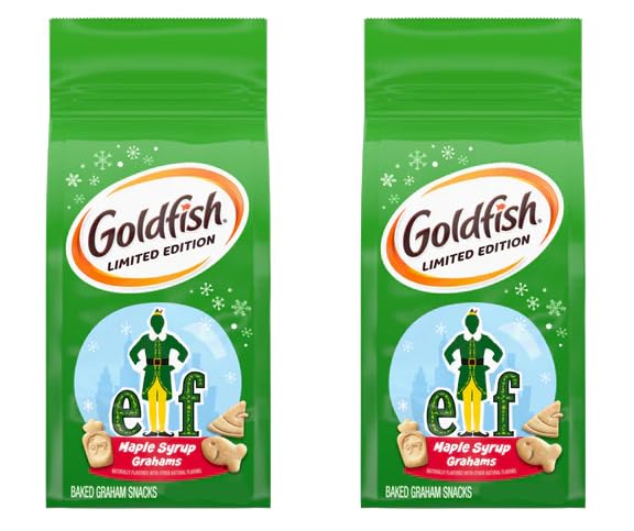 New Limited Edition Goldfish Elf Maple Syrup Flavored Grahams will bring smiles and spread holiday cheer just in time for the beloved holiday movie's 20th Anniversary! Our new seasonal graham crackers are irresistibly delicious, with flavors of sweet brown sugar and butter and the taste of caramel and vanilla in every fun-shaped bite. Perfect for snacking, gifting, or for your holiday gathering!Enjoy the bonus trivia cards while you are snacking and learn some interesting new facts about a variety of topics. GO FOR THE HANDFUL: The bag is the perfect snack for your holiday movie watch party and holiday gatherings or for a sweet afternoon snack treat anytime the mood hits. HOLIDAY SWEET TREAT: Spread holiday joy and bring smiles with Goldfish Limited Edition Elf Maple Syrup Flavored Grahams which make perfect stocking stuffers or tasty snacks all season long. LIMITED EDITION: These limited edition maple syrup graham crackers featuring traditional Goldfish and iconic shapes inspired by Buddy will spark holiday cheer, only available for a limited time. MAPLE SYRUP FLAVORED GRAHAMS: Inspired by syrup - one of elves' four main food groups. Enjoy delicious flavors of sweet brown sugar and butter, with the taste of caramel and vanilla. Inspired by Buddy!. Includes (2) packages of Goldfish Grahams Elf Maple Syrup Flavour Holiday Edition, Snack Crackers (180g per package).