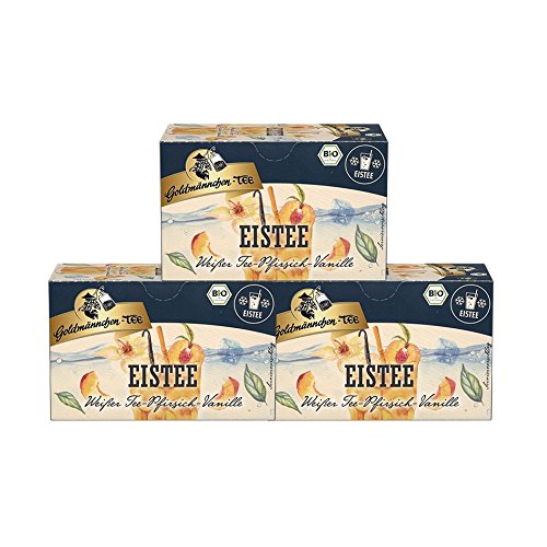 Organic white tea blend naturally flavored with peach-vanilla flavor. The fine fruit acid of the fully ripe peach flavor envelops the delicate and floral white tea base. Let yourself be refreshed and seduced. An iced tea with an elegant whistle. Recommendations: Pour 1 filter bag per cup with 100-150 ml of fresh sparkling boiling water. Remove tea bags after 5 minutes and immediately fill with 2-3 ice cubes. Cut the lemon into slices and serve with the tea and 2 more ice cubes in the glass with mint or balm as desired. The tea tastes particularly good sweetened. INGREDIENTS Organic white tea, white organic hibiscus flowers, natural flavor (peach, vanilla), organic peaches, organic vanillaGoldm?nnchen-Tee EISTEE Wei?er Tee Perzik Vanille, 3-pack Biologisch wit theemengsel natuurlijk gearomatiseerd met perzik-vanillesmaak. Het fijne vruchtzuur van de volrijpe perziksmaak omhult de delicate en bloemige witte theebasis. Laat je verfrissen en verleiden. Een ijsthee met een elegant fluitje. Aanbevelingen: 1 filterzak per kop met 100-150 ml vers bruisend kokend water overgieten. Theezakjes na 5 minuten verwijderen, direct vullen met 2-3 ijsblokjes. Citroen in schijven snijden en met de thee en nog 2 ijsblokjes in het glas naar wens serveren met munt of melisse. Gezoet smaakt de thee bijzonder goed. INGREDIËNTEN Biologische witte thee, witte biologische hibiscus bloemen, natuurlijk aroma (perzik, vanille), biologische perziken, biologische vanille