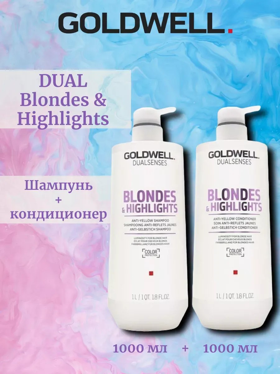 Goldwell DUAL Blondes&Highlights набор представляет собой комбинацию из шампуня и кондиционера, специально разработанных для ухода за светлыми волосами и подчеркивания золотистых оттенков и мелирования. Каждая единица в этом наборе имеет объем 1000мл.