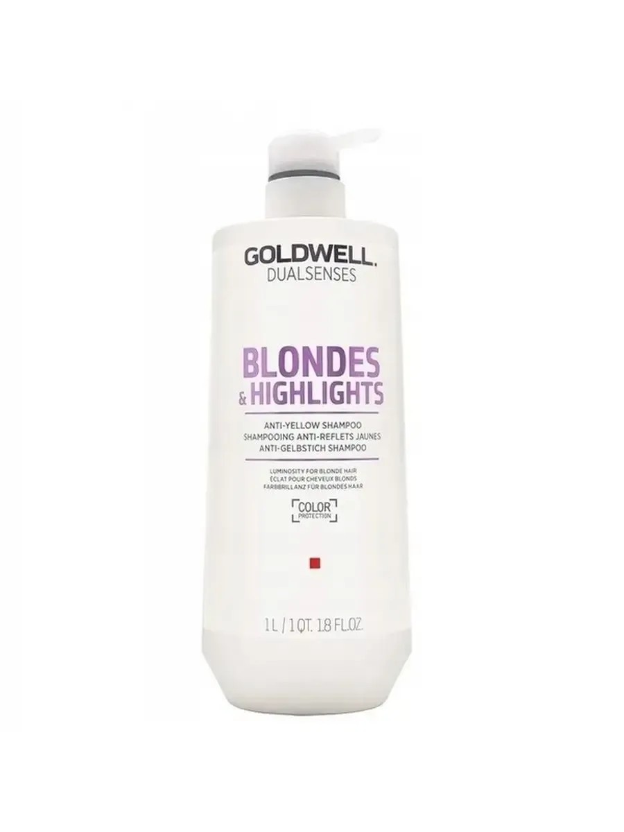 Goldwell Dualsenses Blonde and Highlights Anti-Yellow Shampoo transforms blonde, color-treated hair, refreshing color and eliminating unwanted yellow tones. This ultra-light violet shampoo for blondes removes daily dirt and product buildup, while its unique FadeStop Formula system gently yet effectively combats fading. Innovative Luminescine technology combined with the microPROtec complex transforms invisible UV rays into visible ones, instantly adding shine and making your tone more vibrant. Hair is left clean and refreshed, while the formula's color protection system helps it maintain a beautiful golden hue for long. Distribute through wet hair, massage into lather, and rinse thoroughly.