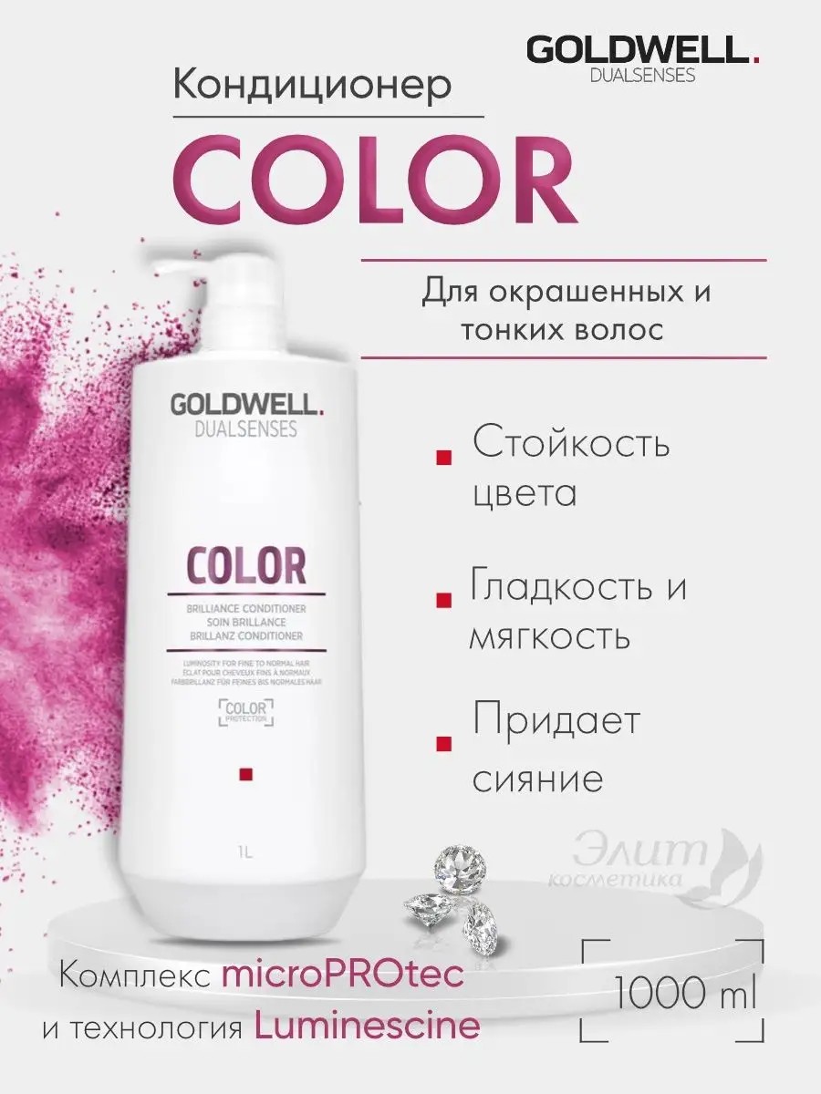 Goldwell Dualsenses Color Brilliance Conditioner - Conditioner for Colored Hair. What it does: Invisibly and gently cares for your locks and color, leaving them looking healthy. Result: The conditioner's complex ingredients help maintain the long-lasting, rich color of color-treated hair, making it manageable and smooth. Ingredients: pomegranate extract, UV filters, water. Directions: Apply to washed hair for a short time, massaging the scalp, then rinse with warm water.