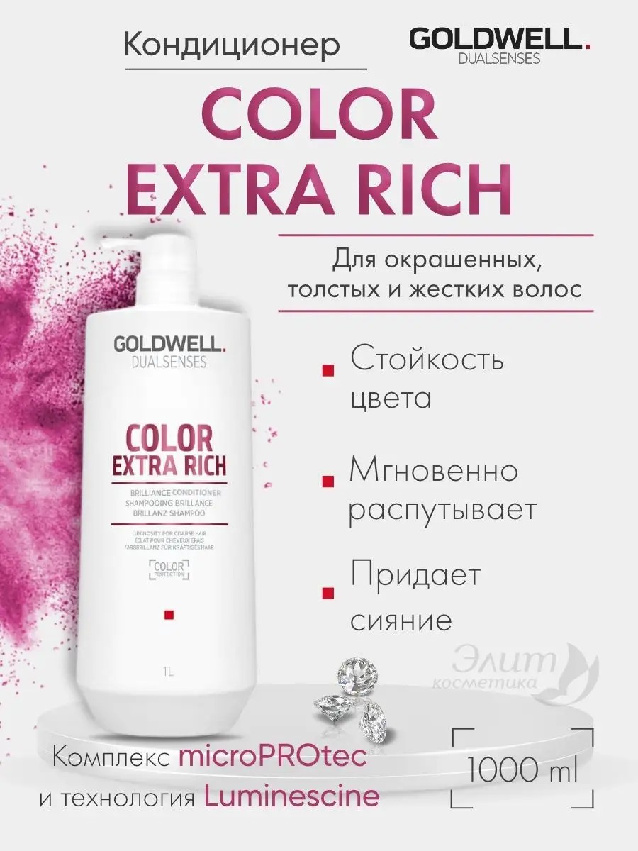 Goldwell Dualsenses Color Extra Rich Brilliance Conditioner Conditioner for colored hair. What it does: Conditioners in the Color Extra Rich series have a beneficial effect on the quality of hair, while making its color even brighter. The conditioner ensures easy combing of thick, coarse, colored hair. Result: Moisturized and elastic hair that does not require frequent coloring. Hair looks like you just left the salon. Ingredients: Pomegranate seed extract, panthenol, glycerin, propylene glycol, citric acid, glycoproteins. How to use: Apply the product to wet hair, lather, evenly distributing the foam along the entire length, and rinse thoroughly.