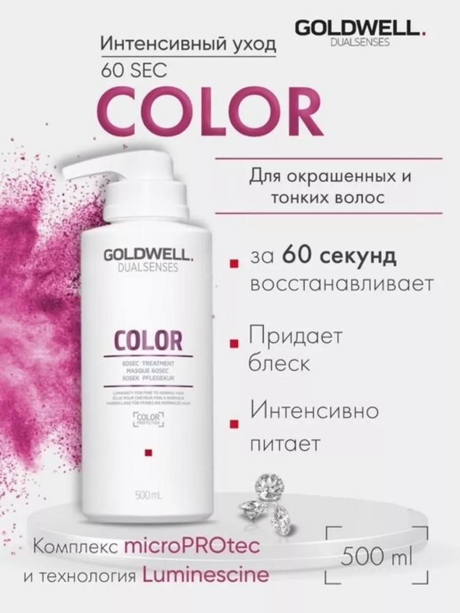 60SEC TREATMENT - УХОД ЗА 60 СЕКУНД ДЛЯ БЛЕСКА ОКРАШЕННЫХ ВОЛОС. Профессиональный интенсивный уход для тонких и нормальных волос, для придания блеска волосам немецкого бренда Goldwell. Подходит для регулярного ухода за нормальными и истонченными натуральными и окрашенными волосами. Содержит комплекс microPROtec и технологию Luminescine. Мгновенно восстанавливает структуру волос на 100% за 60 секунд. Усиливает естественное сияние волос, интенсивно питает их и сохраняет стойкость цвета.Облегчает процесс расчесывания, питает, увлажняет и сохраняет цвет благодаря системе FadeStopFormula. Красота и здоровый блеск обеспечены с шампунем Goldwell. **Способ применения:** нанести средство на влажные, подсушенные полотенцем волосы, отступив на 3 см от кожи головы, оставить на 60 секунд, затем тщательно смыть водой. Для максимального эффекта рекомендуется использовать шампунь и кондиционер серии уходовой косметики Professional Goldwell Dualsenses Color.