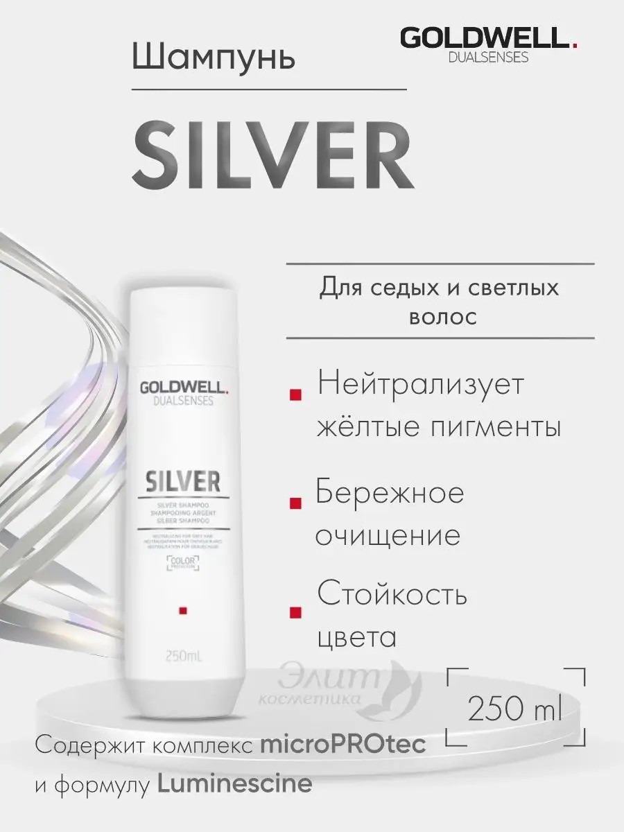 Goldwell Dualsenses Refining Silver Shampoo - Corrective shampoo for gray and lightened hair. Shampoo for bleached and highlighted hair. The highly effective SilverChromaComplex corrective complex with lavender and instant-action microfluidic technology strengthens and moisturizes hair. Contains active complexes microPROtec and Luminescine, which provide instant shine and nourishment. Gently cleanses hair while preserving color, thanks to the FadeStopFormula system. Neutralizes unwanted yellow tones and enhances cool pigments. How to use: Apply shampoo to damp hair.