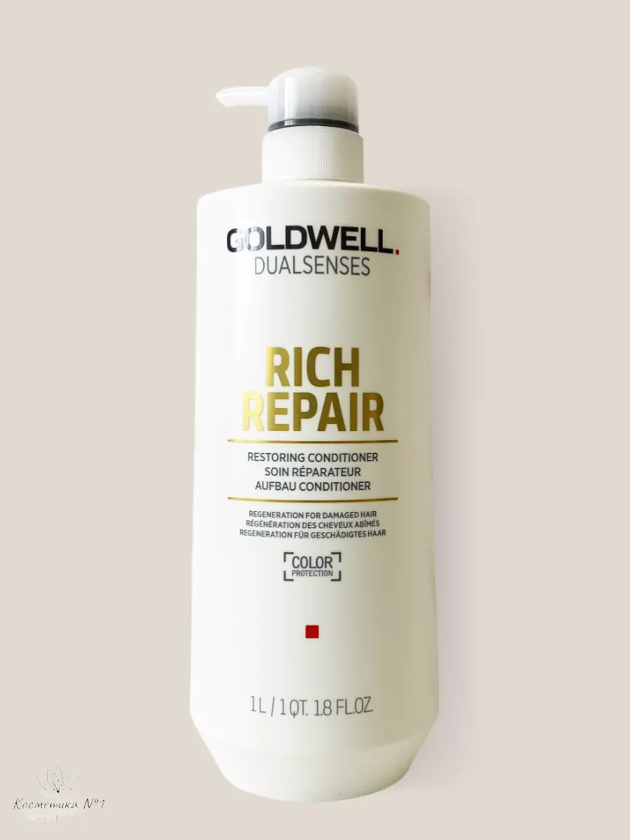 Dualsenses Rich Repair Restoring Conditioner from Goldwell nourishes damaged hair and promotes its health. Its thick, creamy texture applies smoothly and rinses out easily, leaving behind a pleasant scent of ripe fruit. It doesn't stick or weigh down strands. Its balanced, patented formula, based on a unique complex combined with natural oil extracts, a color-fixing molecule, and provitamin B5, helps preserve color, prevents pigment leaching and fading, and provides a beneficial effect on curls, leaving them smooth and shiny. It also makes styling easier and eliminates frizz. With regular use, Rich Repair Restoring Conditioner eliminates static buildup and leaves hair smooth and bouncy. This product is suitable for both professional salon use and at home. For maximum results, stylists recommend using the entire line. This restorative conditioner will not only help your hair achieve an attractive and well-groomed appearance but also maintain it for a long time. It doesn't cause allergic reactions, irritation, or flaking, has a comfortable and economical consistency, and a pleasant, unobtrusive scent that lingers like a delicate scent on your hair or skin for several hours. Designed for women and men who want to look stylish and well-groomed, it makes a wonderful gift for mom, girlfriend, or loved one for a birthday, March 8th, or New Year's. The unique properties of this balm will meet the highest hair care standards and expectations. It is recommended to use this conditioner regularly, and for maximum results, combine it with Goldwell DualSenses Rich Repair Restoring Shampoo and Hair Mask. Don't miss the opportunity to achieve healthy, shiny hair with this unique cosmetic set!