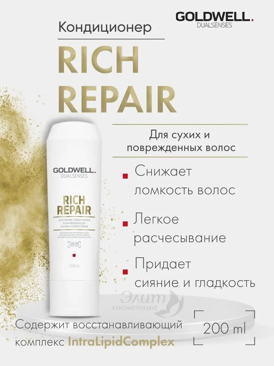 Goldwell Dualsenses Rich Repair Restoring Conditioner - Anti-Fragility Conditioner. What it does: Moisturizing, nourishing, and penetrating deeply into each damaged strand for complete restoration. Hair becomes less weak and brittle. Result: Healthy shine and vitality for flexible, silky hair. Ingredients: Water, panthenol, hydrolyzed keratin, hydrolyzed silk, benzyl salicylate, etc. Directions: Apply Rich Repair Conditioner to slightly damp hair after washing, leave for a few minutes, and rinse thoroughly.